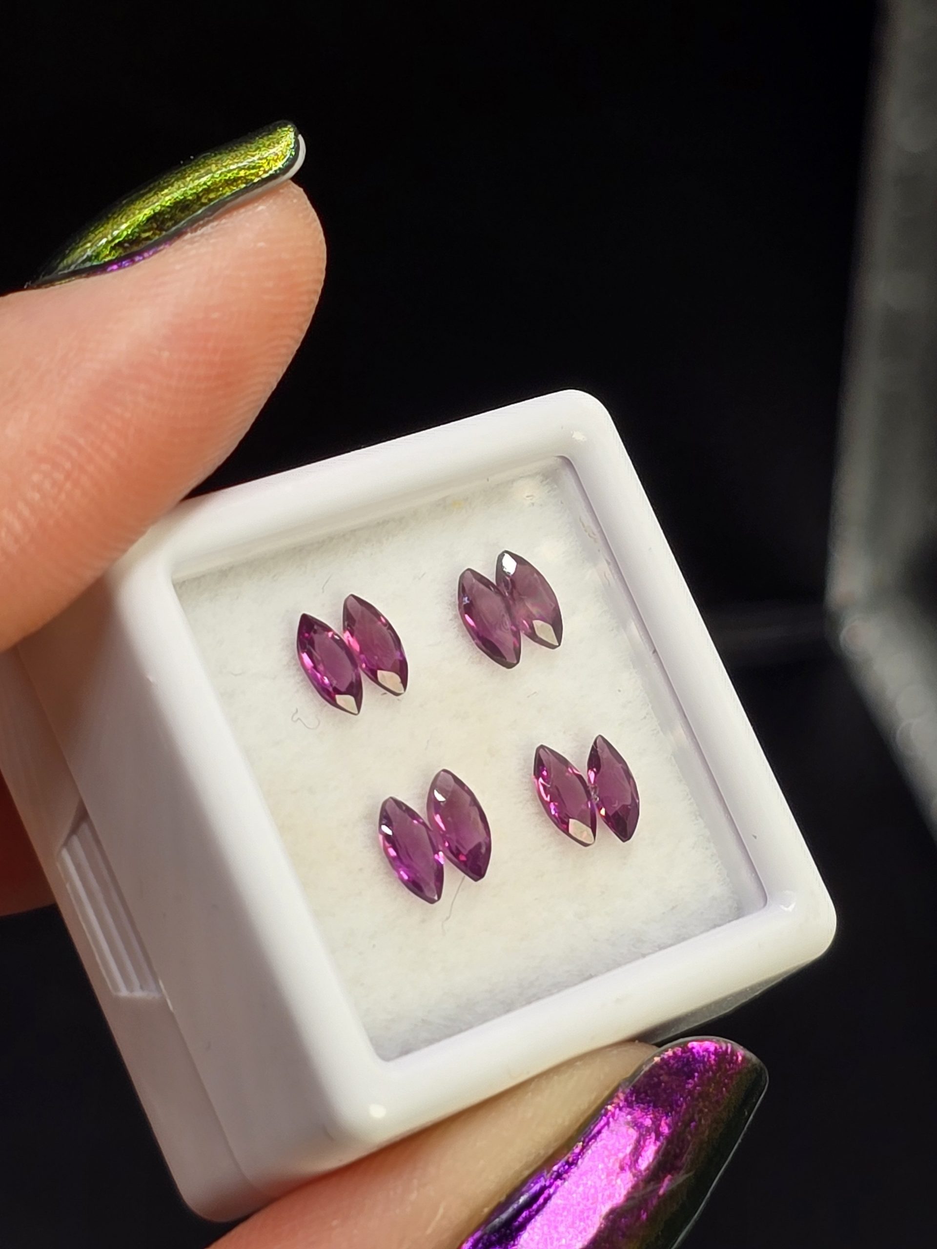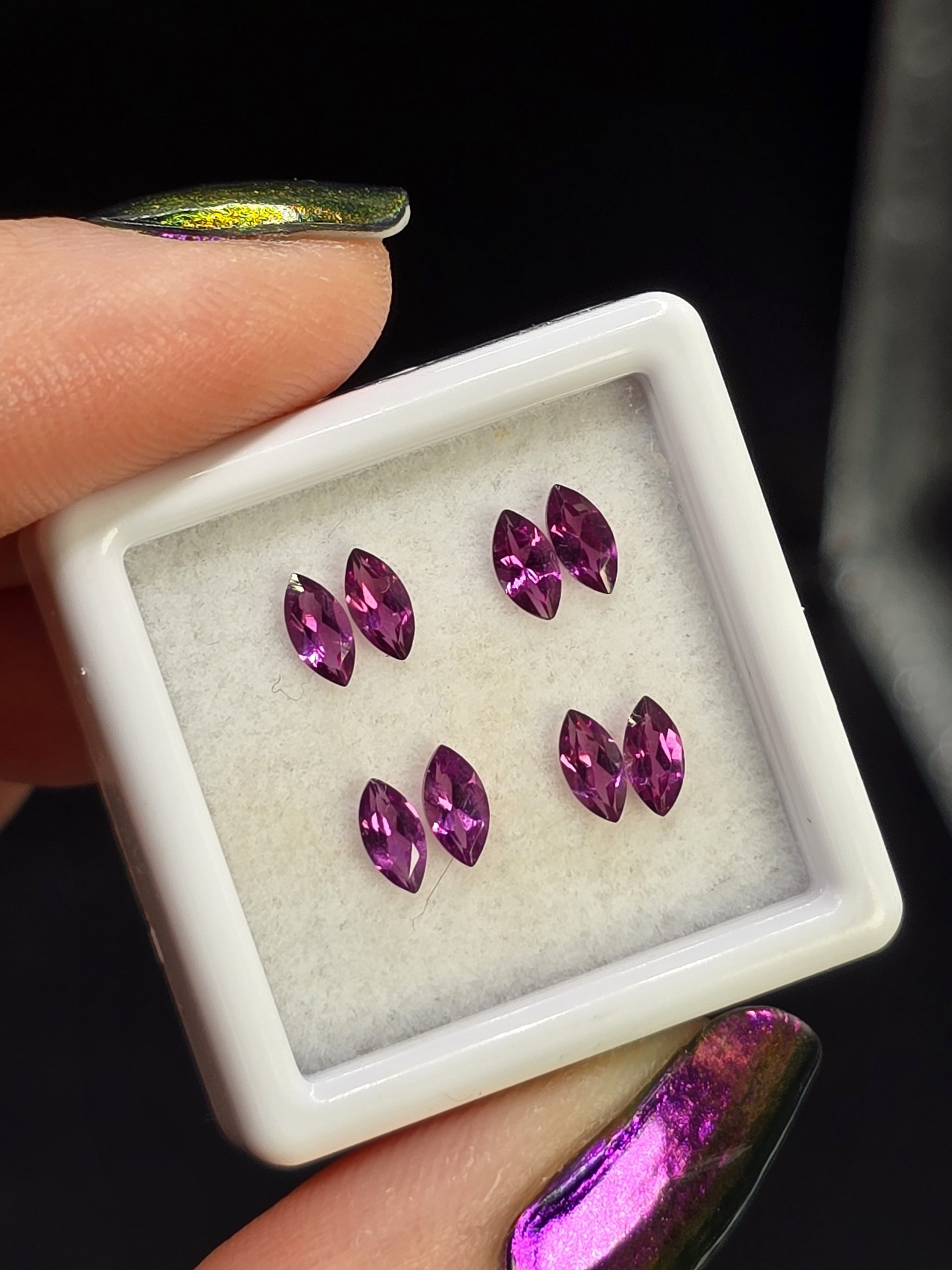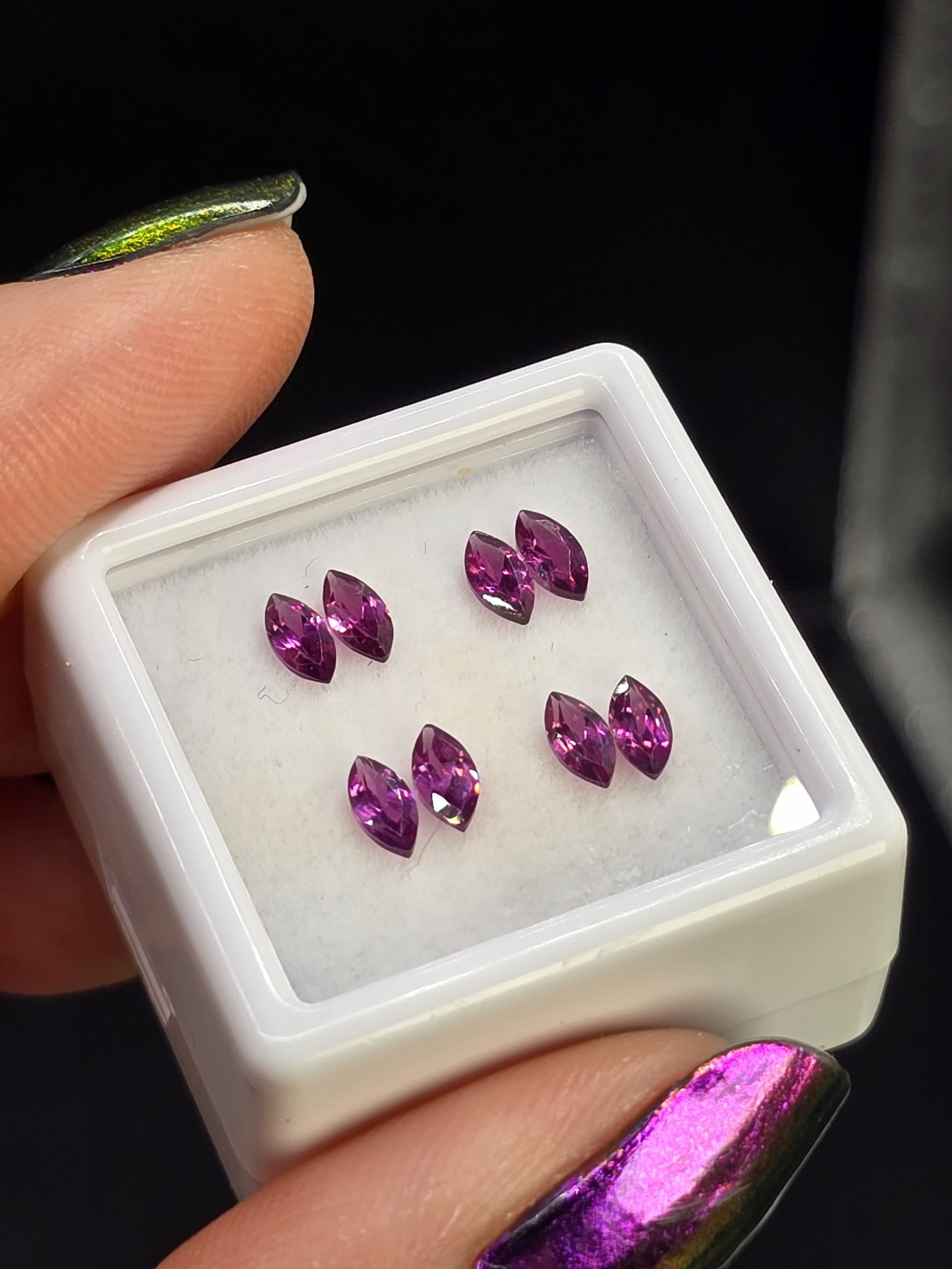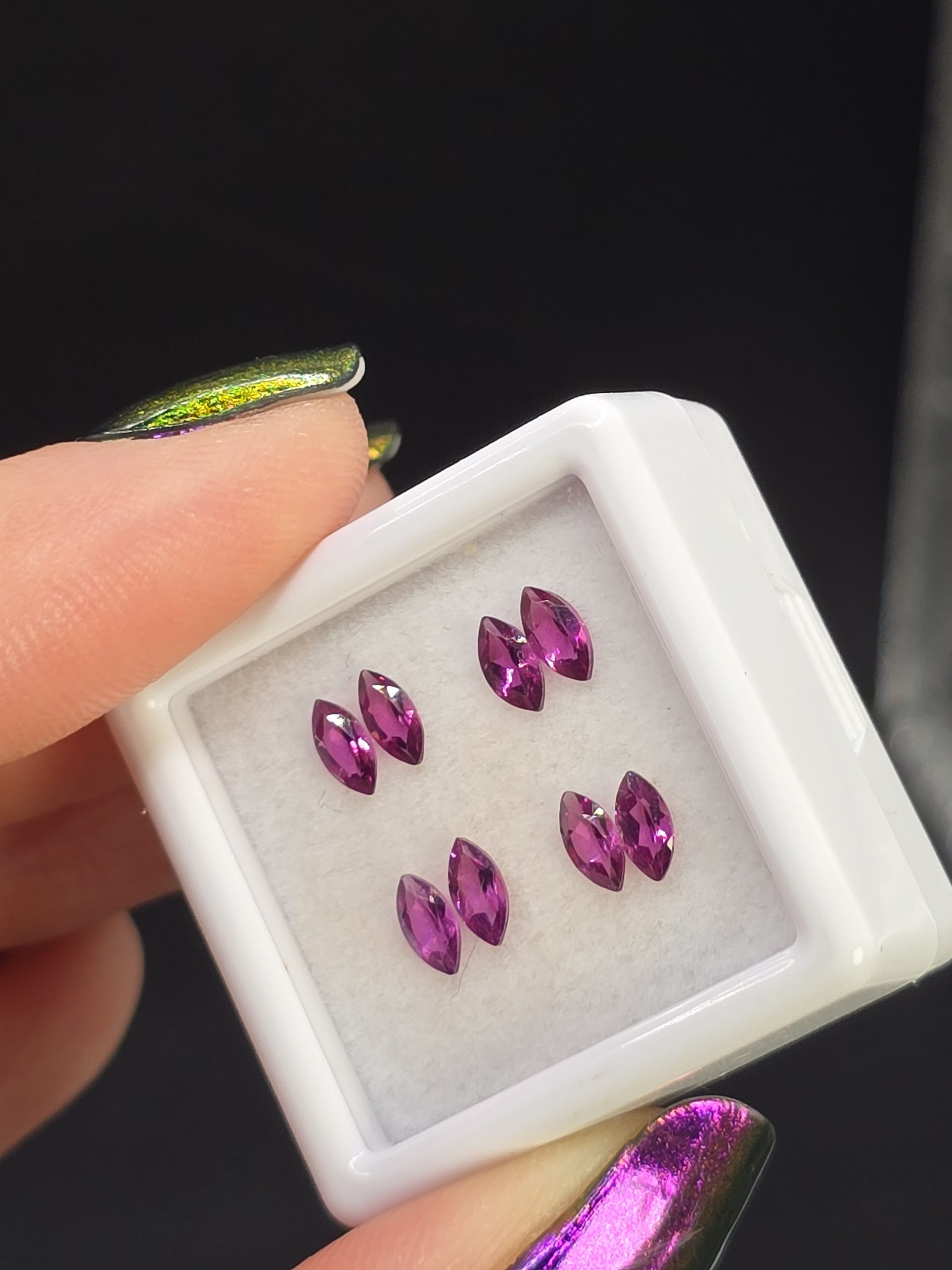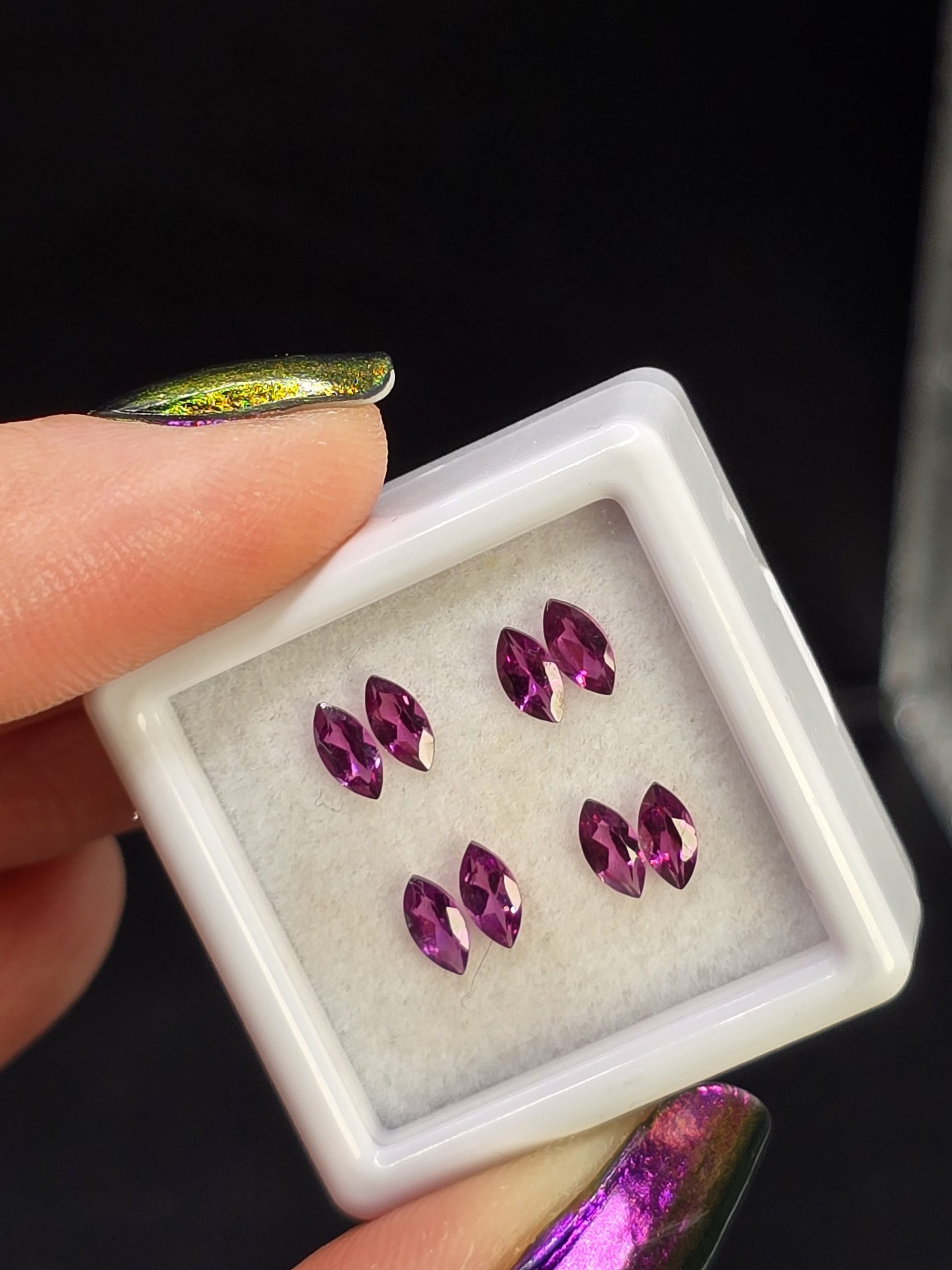 Bonjour je vous propose un beau lot de grenats au violet intense, taillés en forme marquise pour sublimer leur éclat naturel, offrant une excellente symétrie et un beau retour de lumière. Transparence très bonne, sans inclusions visibles à l’œil nu. Leur teinte vibrante et leur brillance en font un choix parfait pour des créations élégantes, qu’il s’agisse de bagues raffinées, de boucles d’oreilles ou de pendentifs délicats. Une gemme qui allie intensité et raffinement.