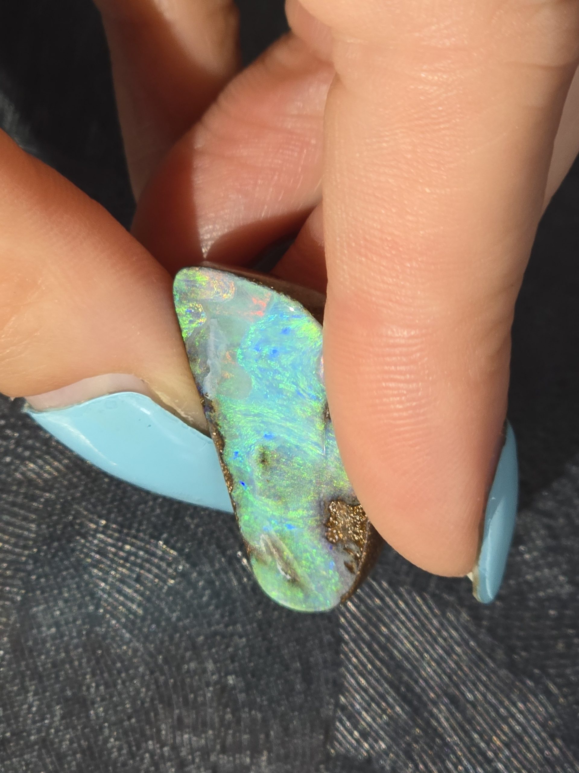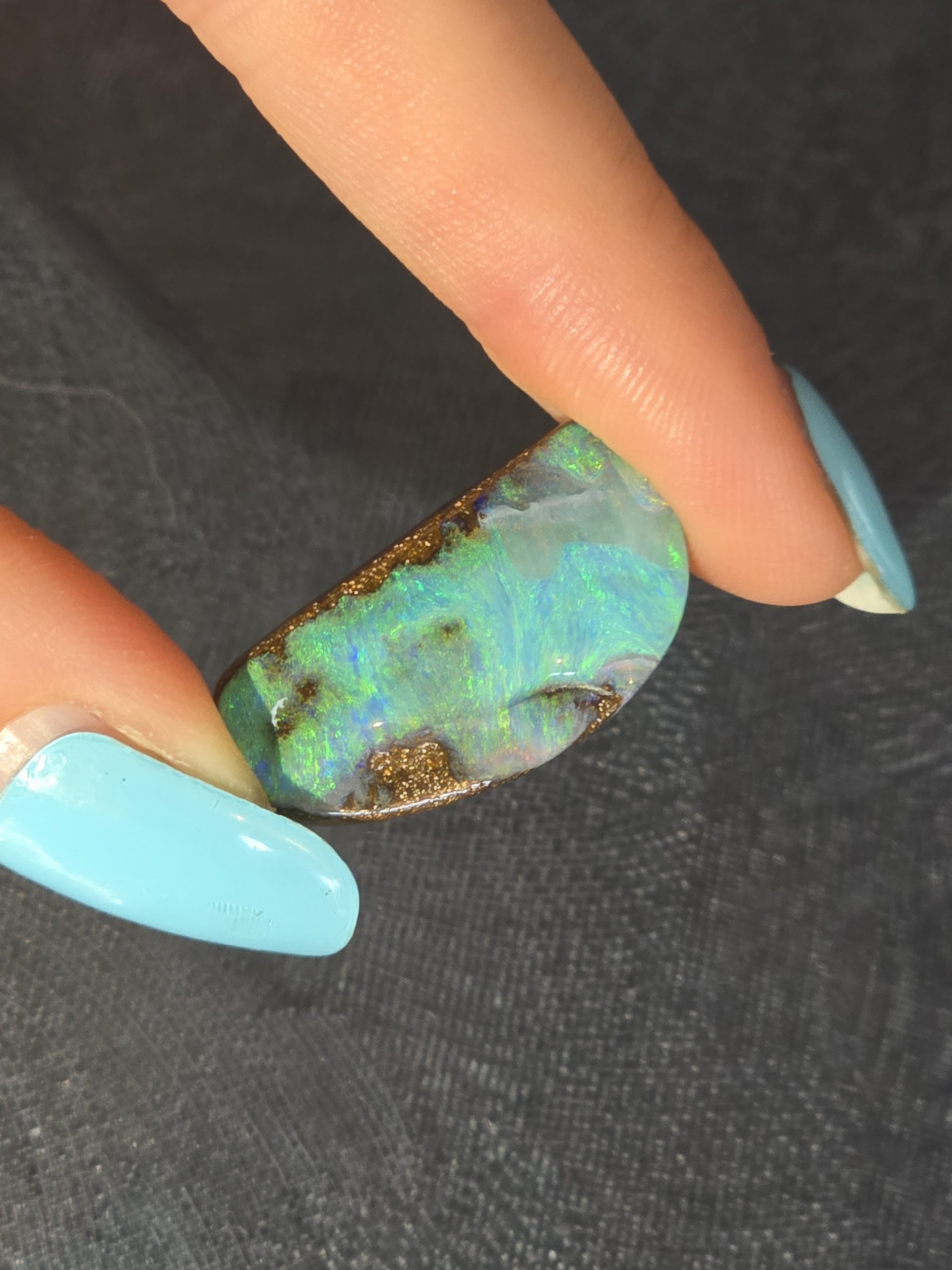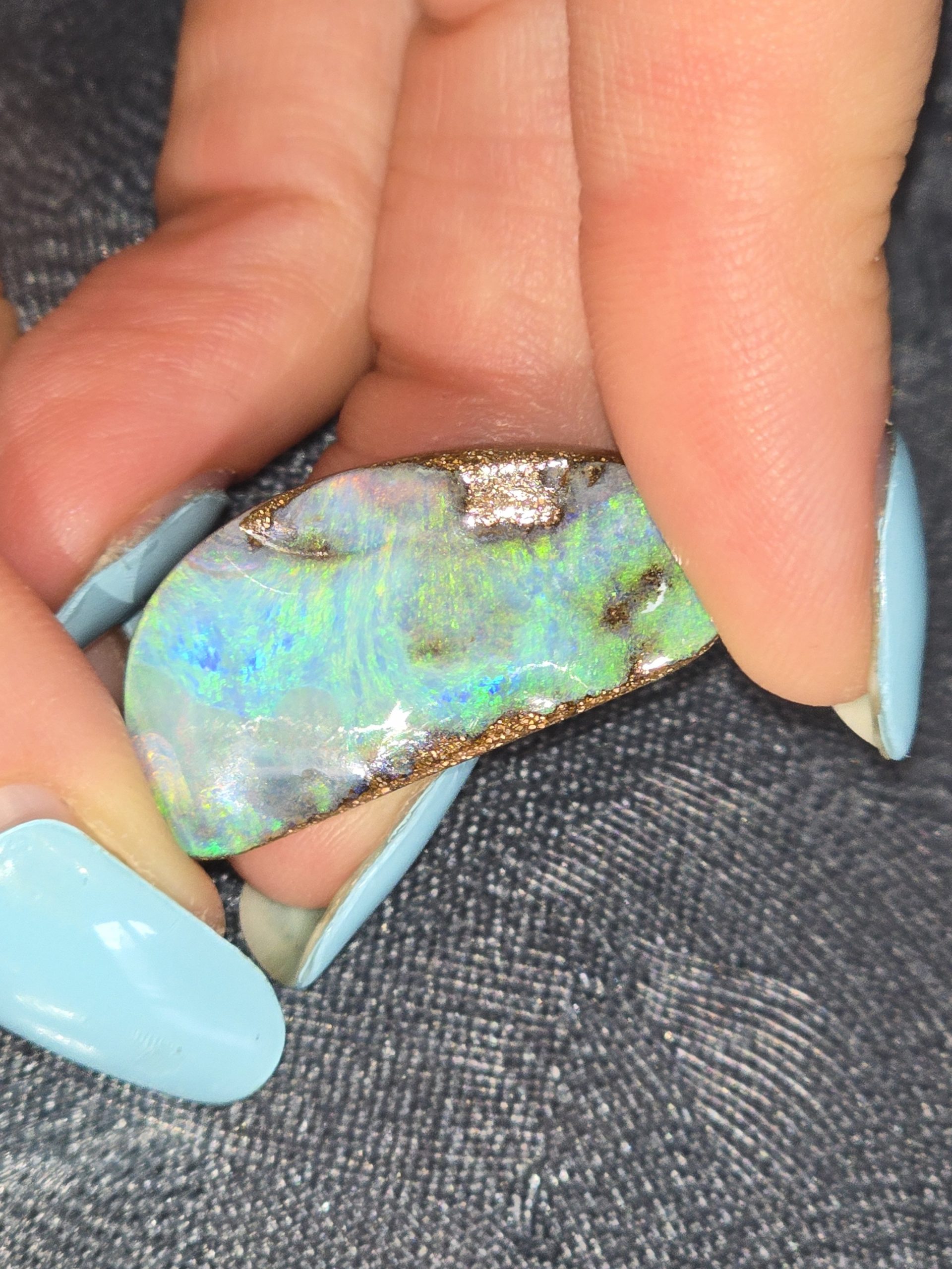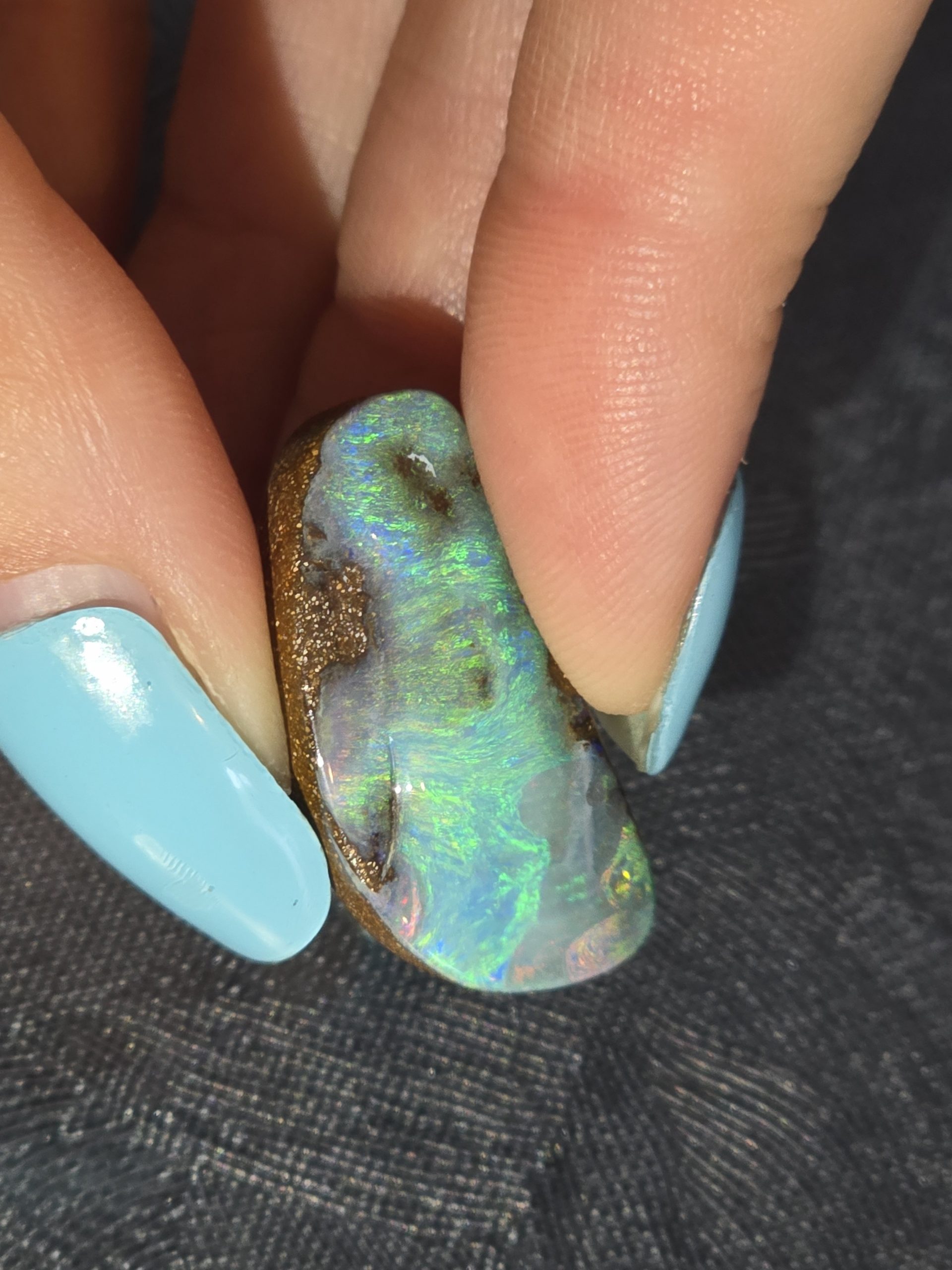 Bonjour je vous propose une superbe opale boulder australienne de 18 carats, mêlant la force de sa matrice de fer à l’éclat intense de ses jeux de couleur. Ses reflets dominants verts et bleus s’animent au moindre mouvement, rehaussés par des touches dorées et irisées qui lui confèrent une profondeur unique.
