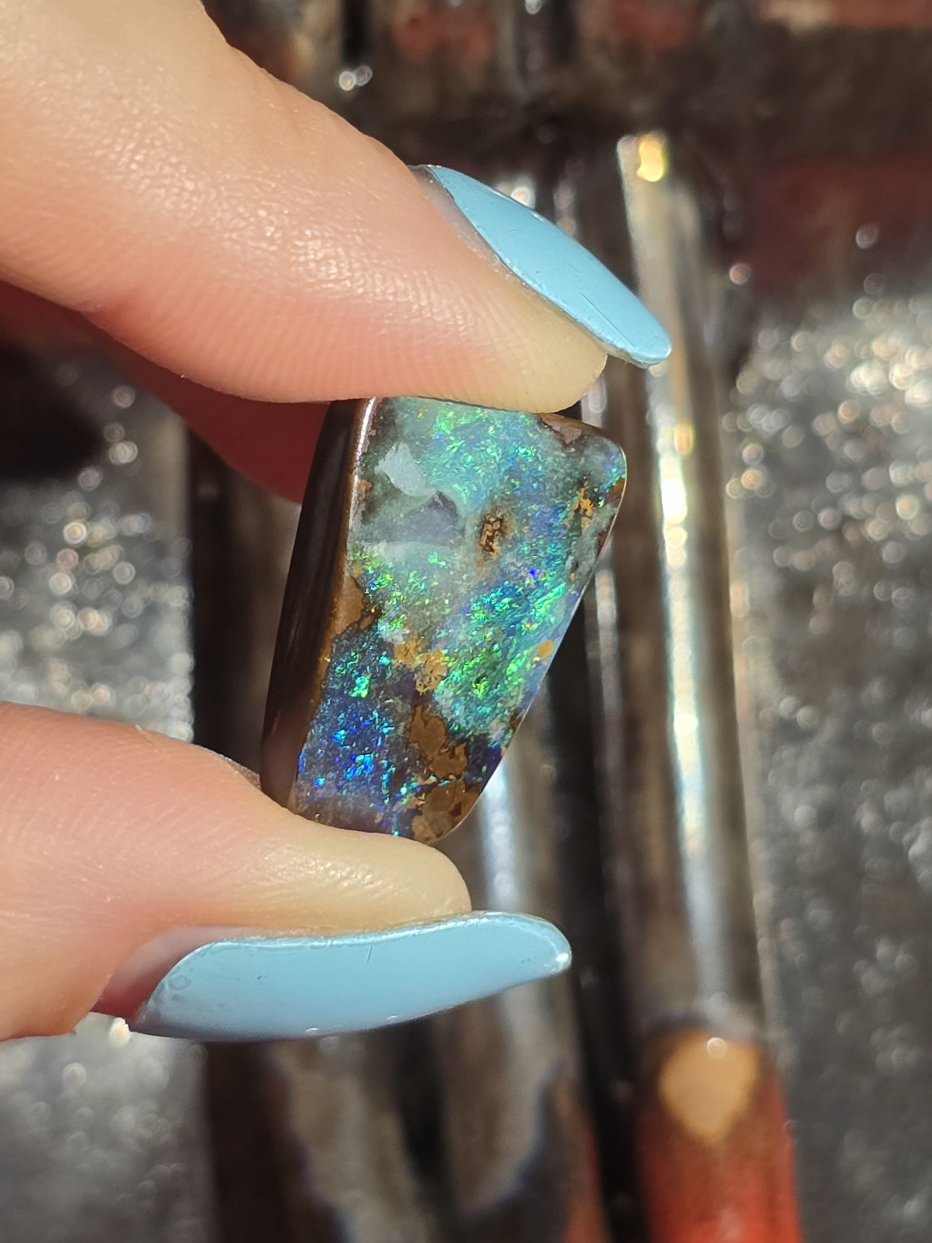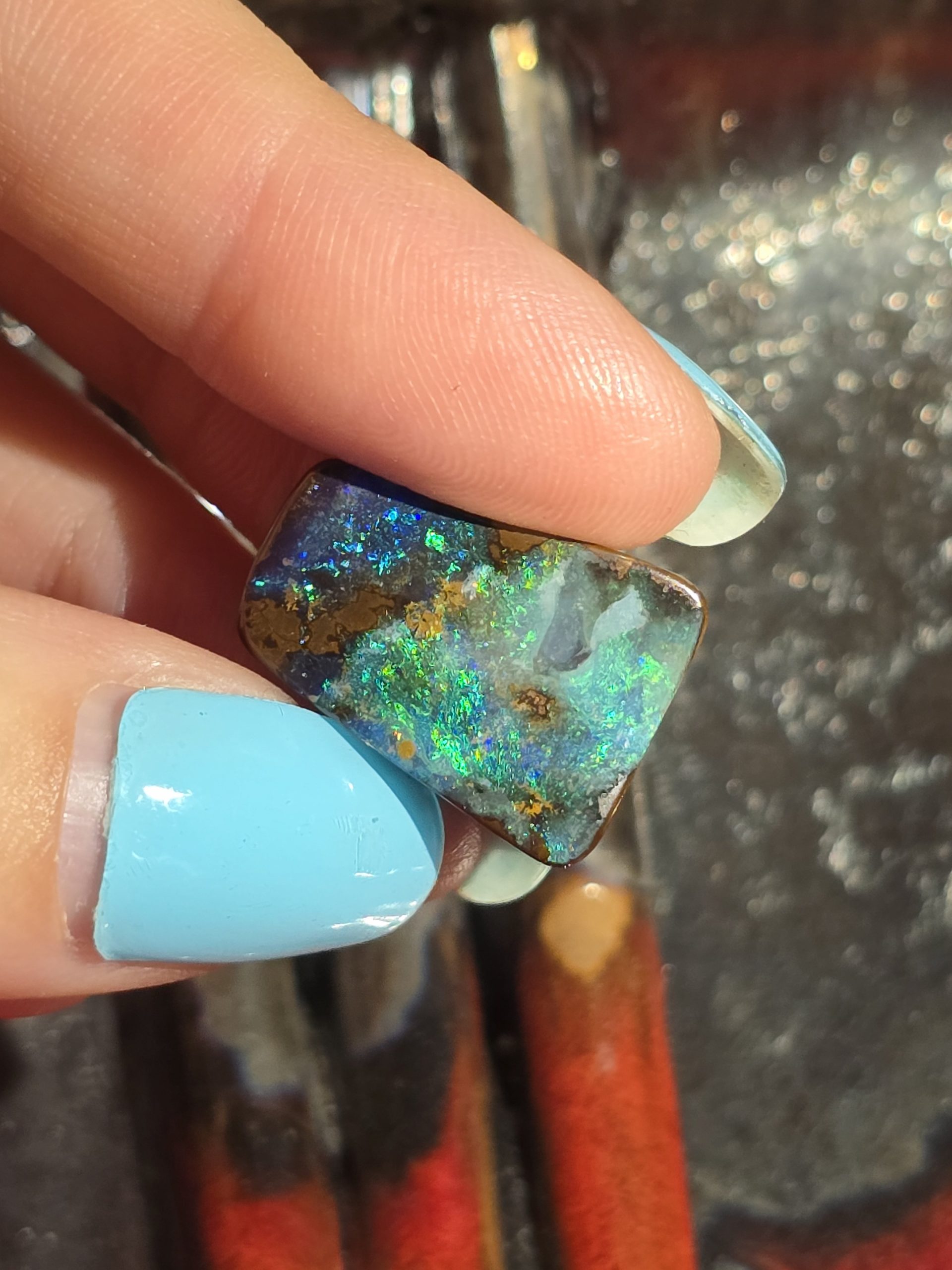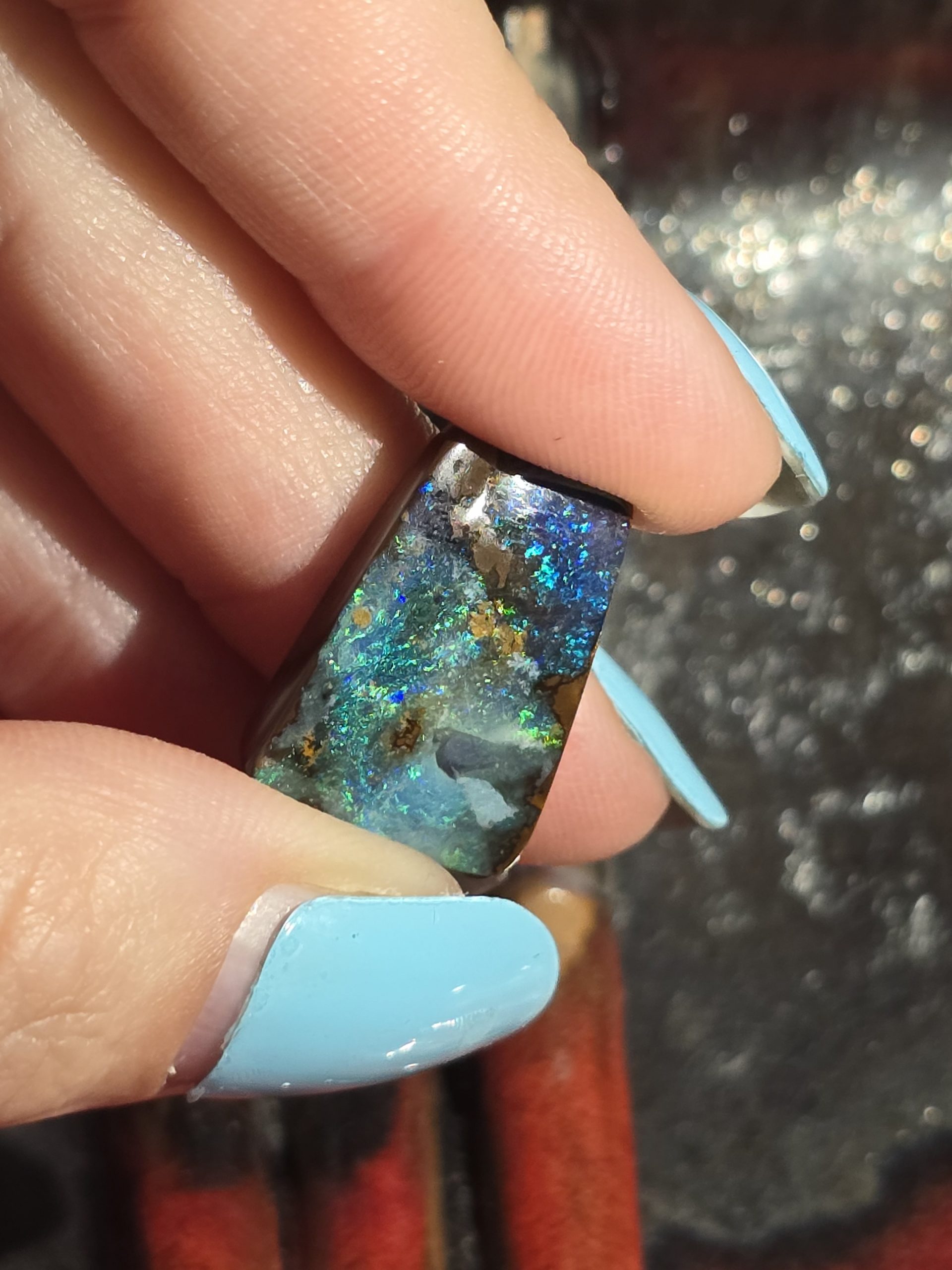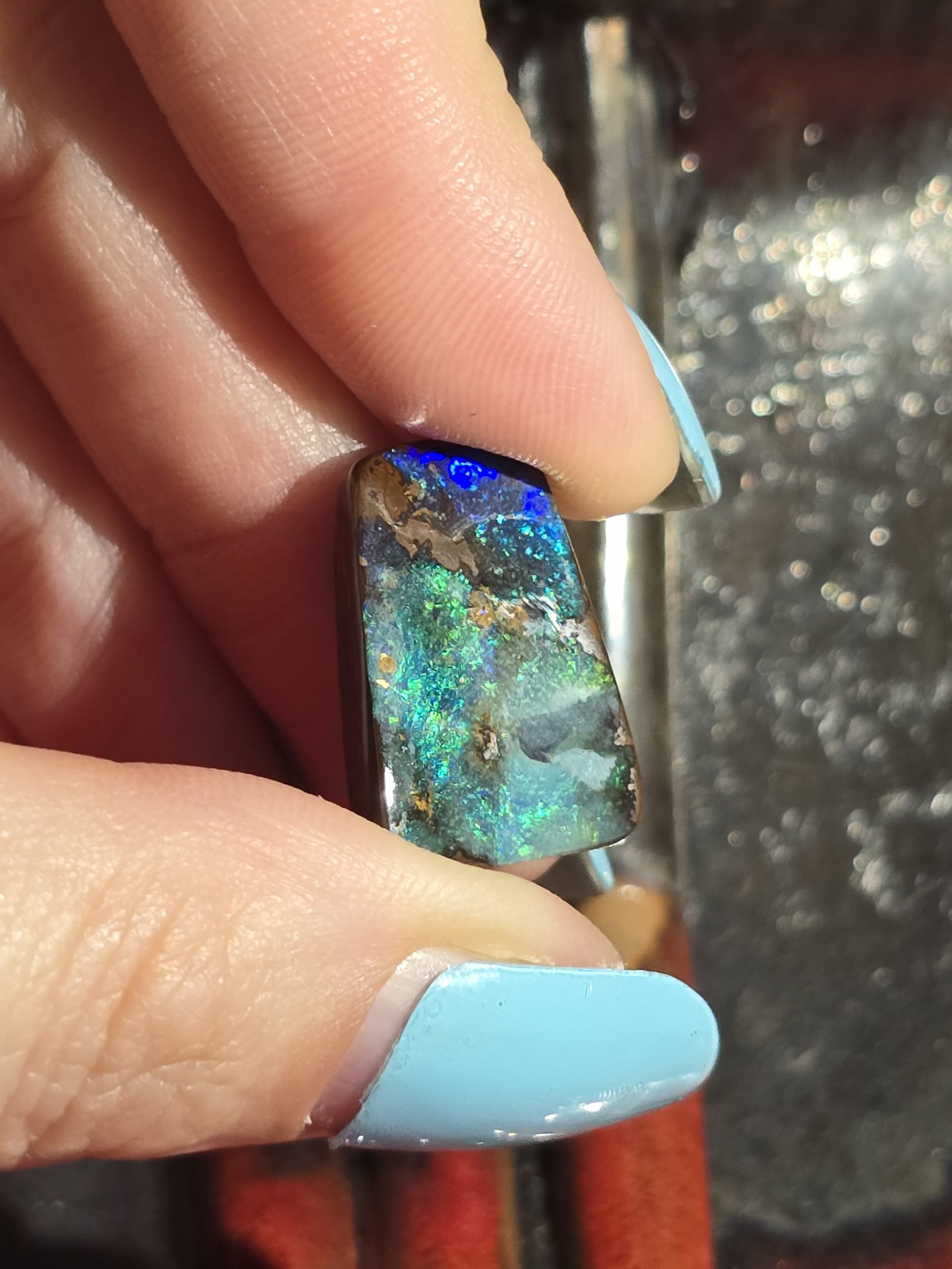 Bonjour je vous propose une Opale boulder taillée, révélant de magnifiques éclats de vert, bleu et turquoise, parcourus de nuances plus sombres qui soulignent la richesse de sa matrice naturelle. La pierre présente un jeu de couleurs vif et profond, avec des zones intenses de bleu électrique et de vert émeraude, animées par la lumière.