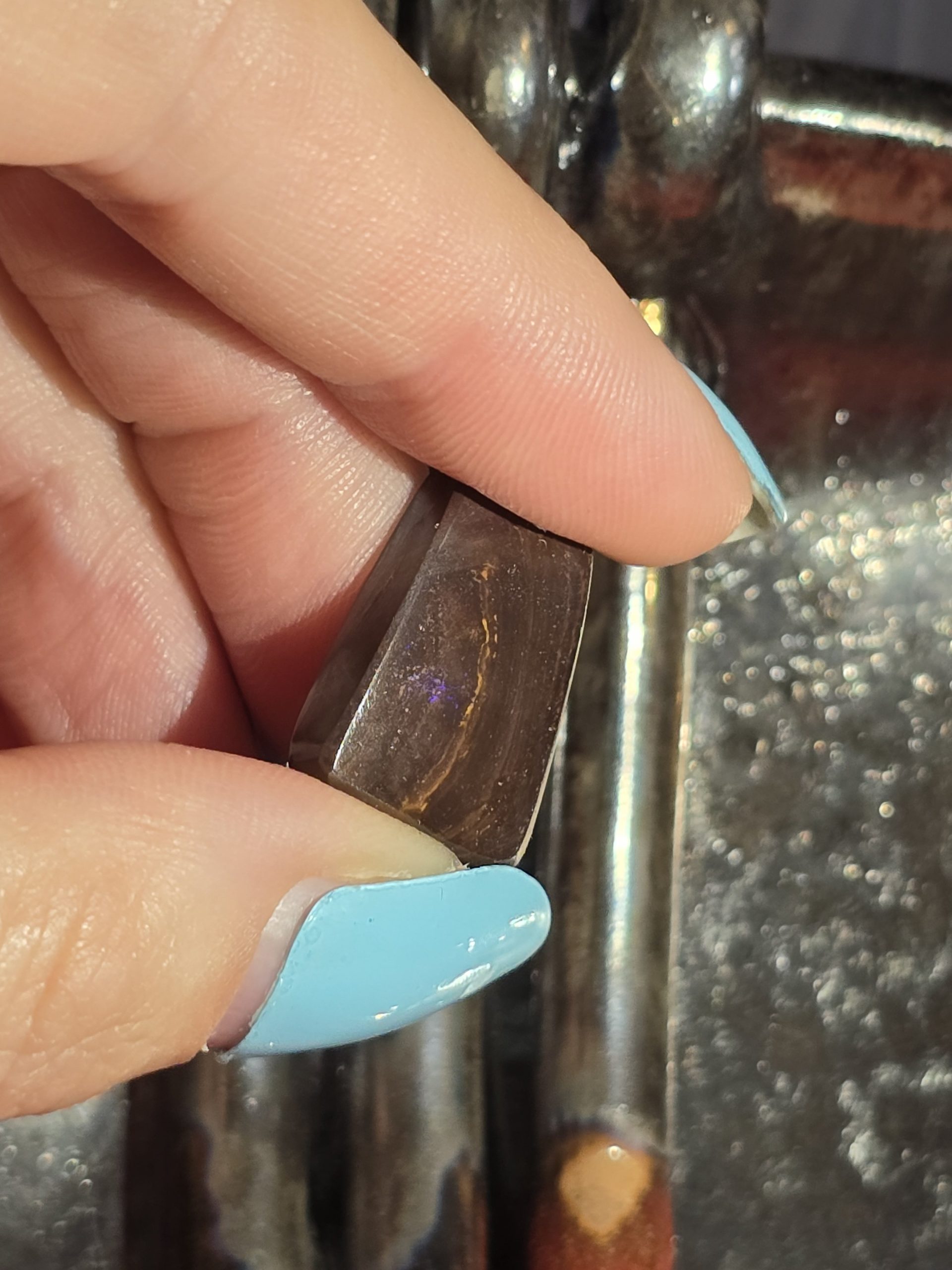 Origine : Queensland, Australie. Cette opale boulder est née dans la roche de fer, ce qui explique son fond brun caractéristique. La couche d’opale s’est formée dans les fissures de la matrice, et c’est cette interaction qui donne ces éclats de couleur uniques.