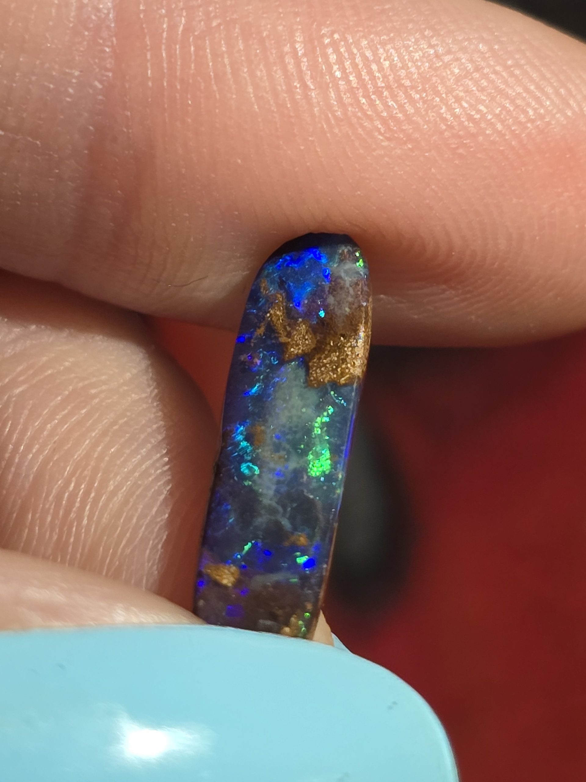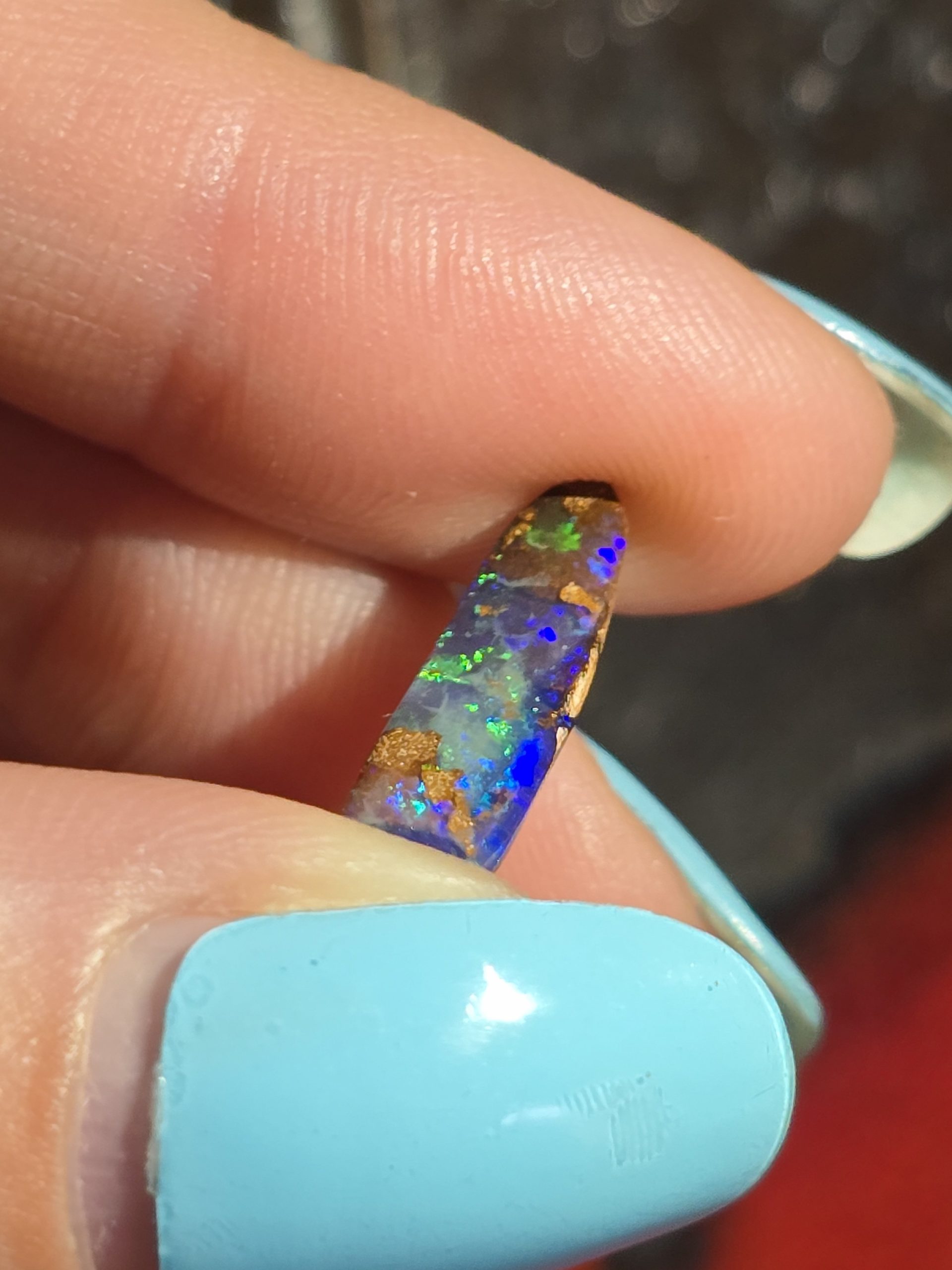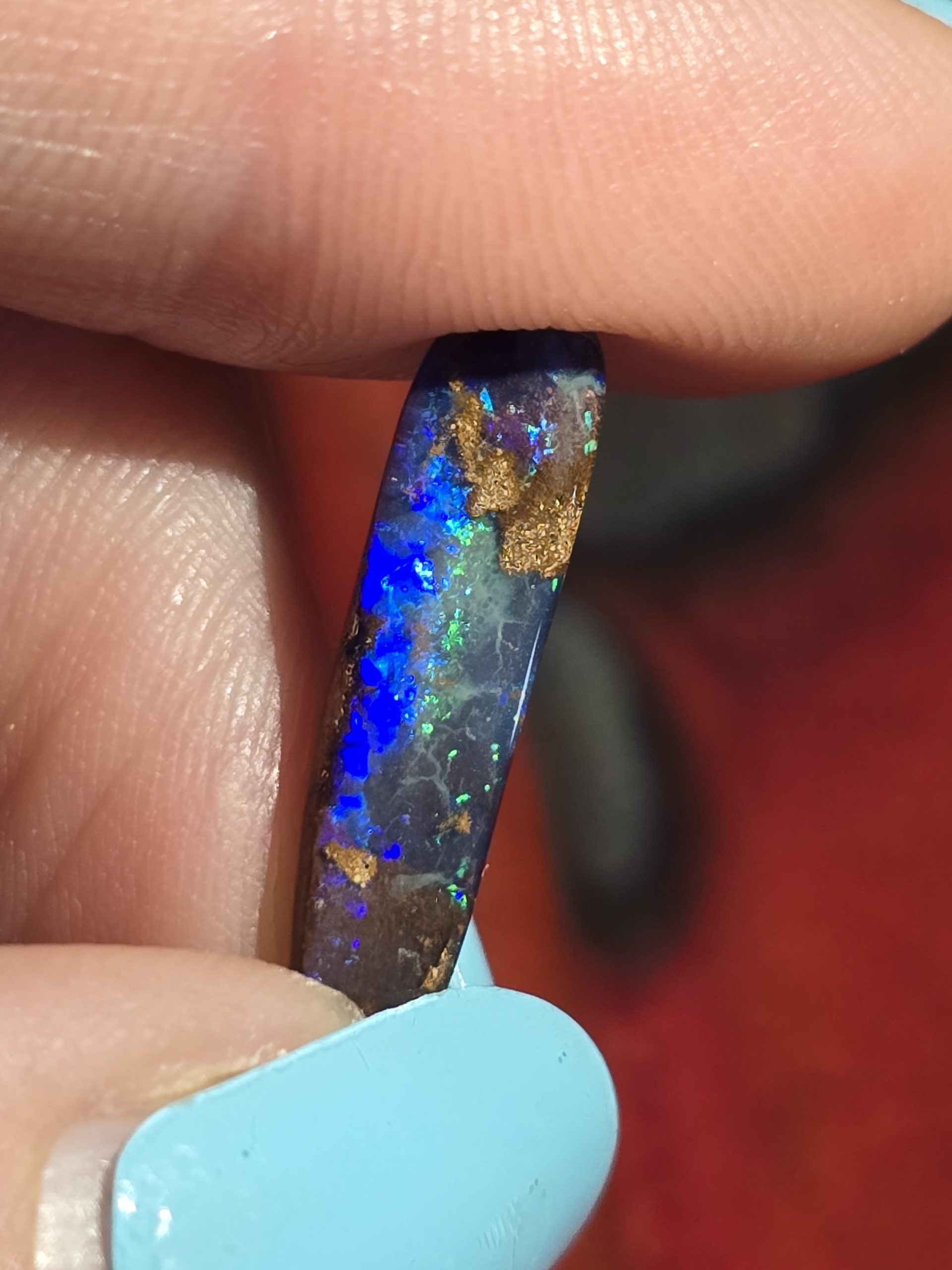 Bonjour je vous propose une superbe opale boulder australienne à la silhouette fine et allongée. Ses reflets intenses de bleu électrique, vert émeraude et touches turquoise jaillissent de la matrice brune, créant un contraste saisissant. La pierre révèle un feu profond et lumineux qui se déplace selon l’angle, lui conférant une allure élégante et singulière, parfaite pour un pendentif raffiné ou une pièce de collection.