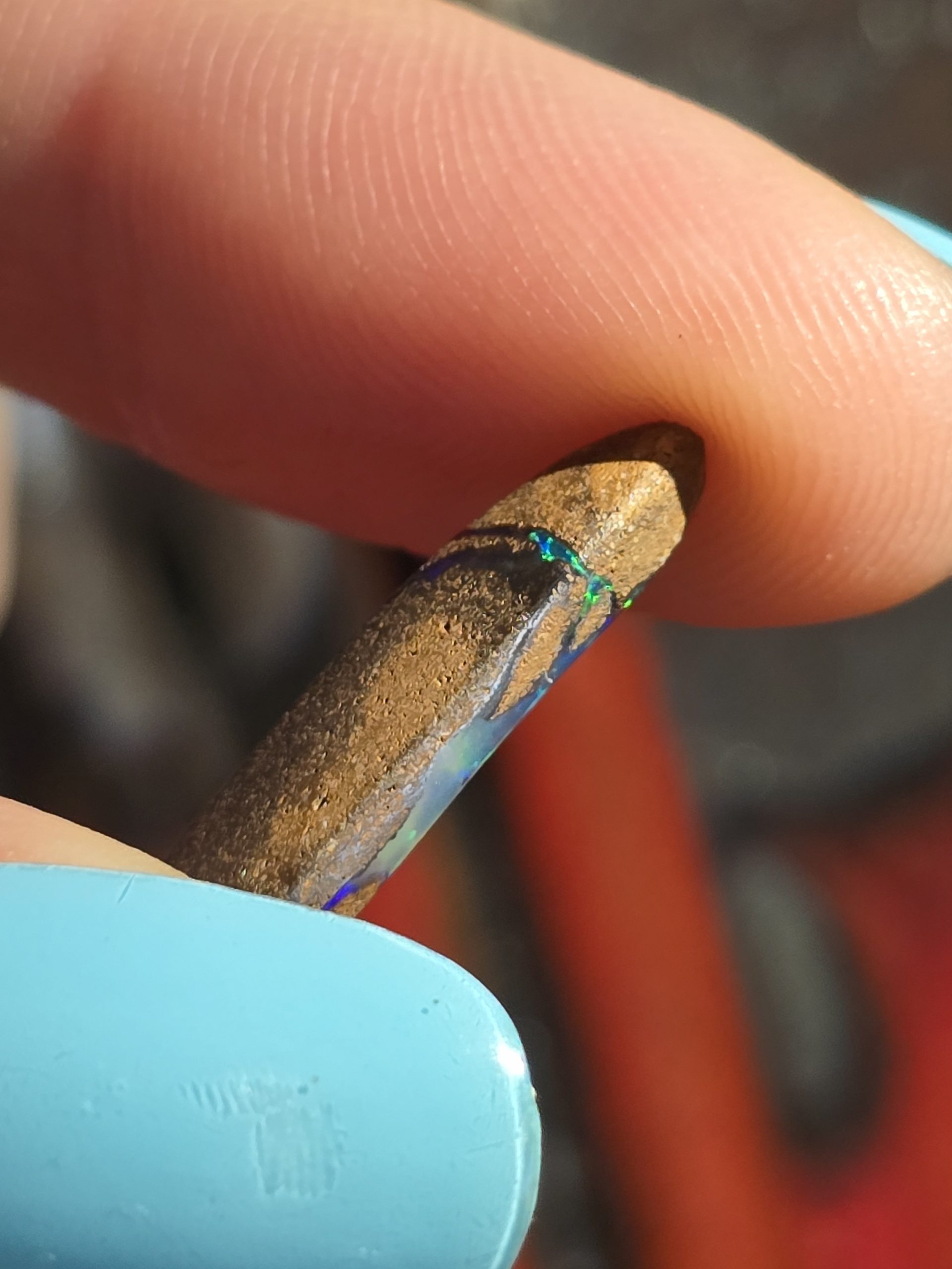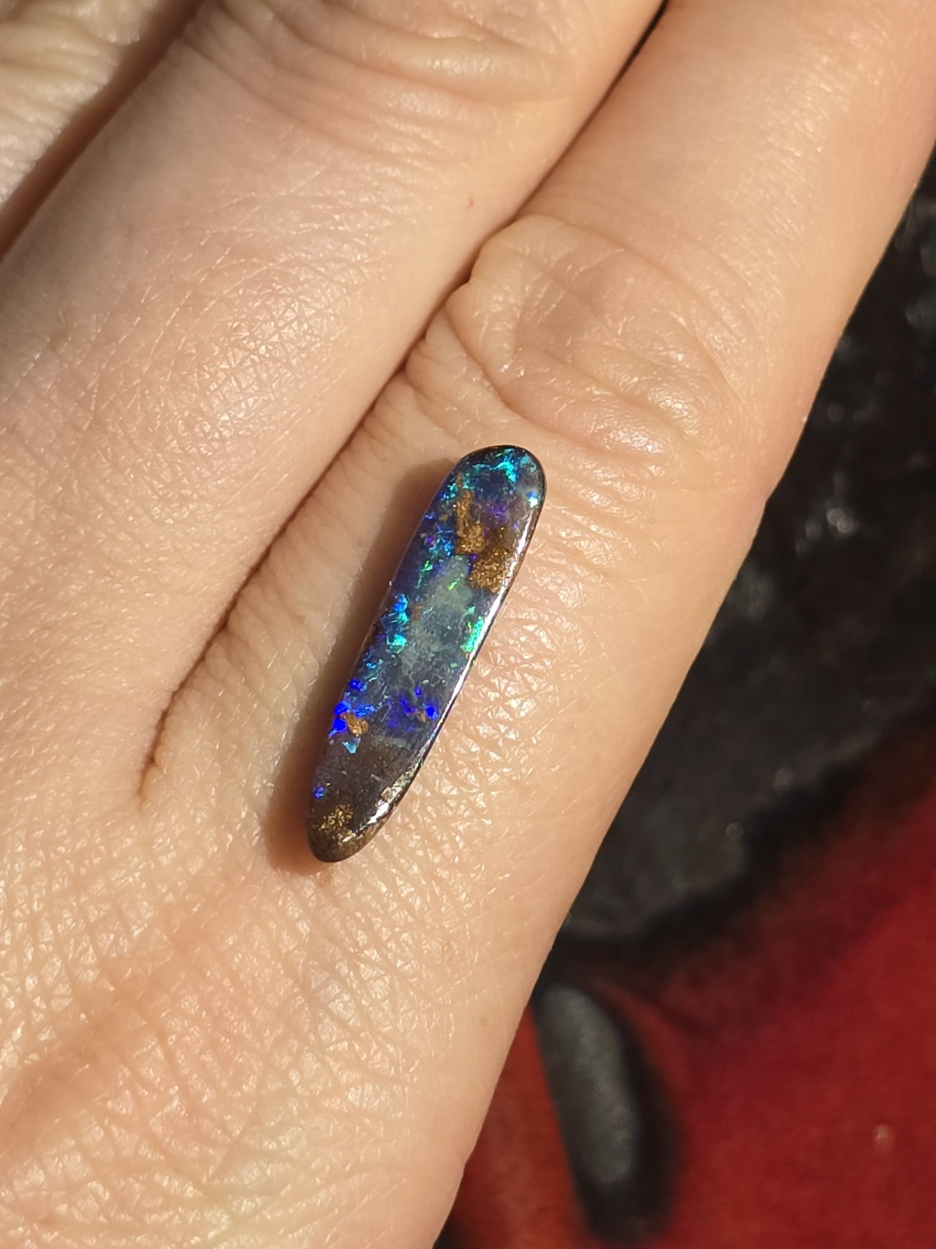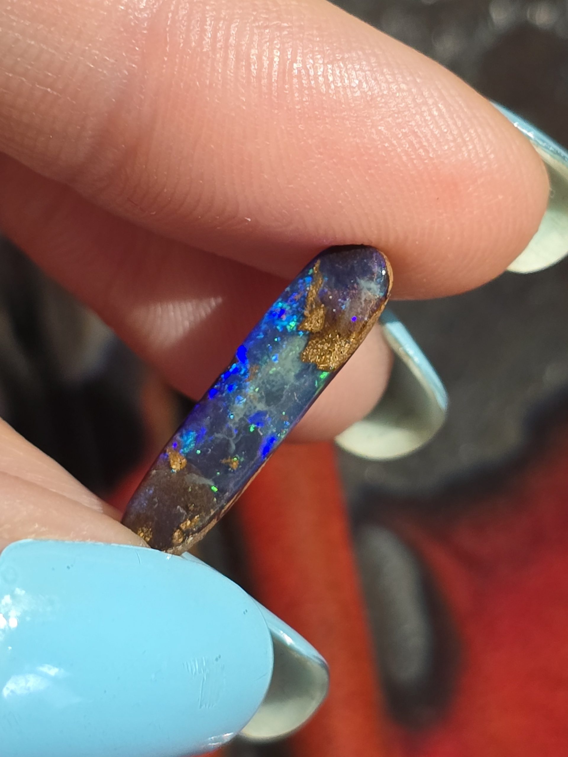 Bonjour je vous propose une superbe opale boulder australienne à la silhouette fine et allongée. Ses reflets intenses de bleu électrique, vert émeraude et touches turquoise jaillissent de la matrice brune, créant un contraste saisissant. La pierre révèle un feu profond et lumineux qui se déplace selon l’angle, lui conférant une allure élégante et singulière, parfaite pour un pendentif raffiné ou une pièce de collection.