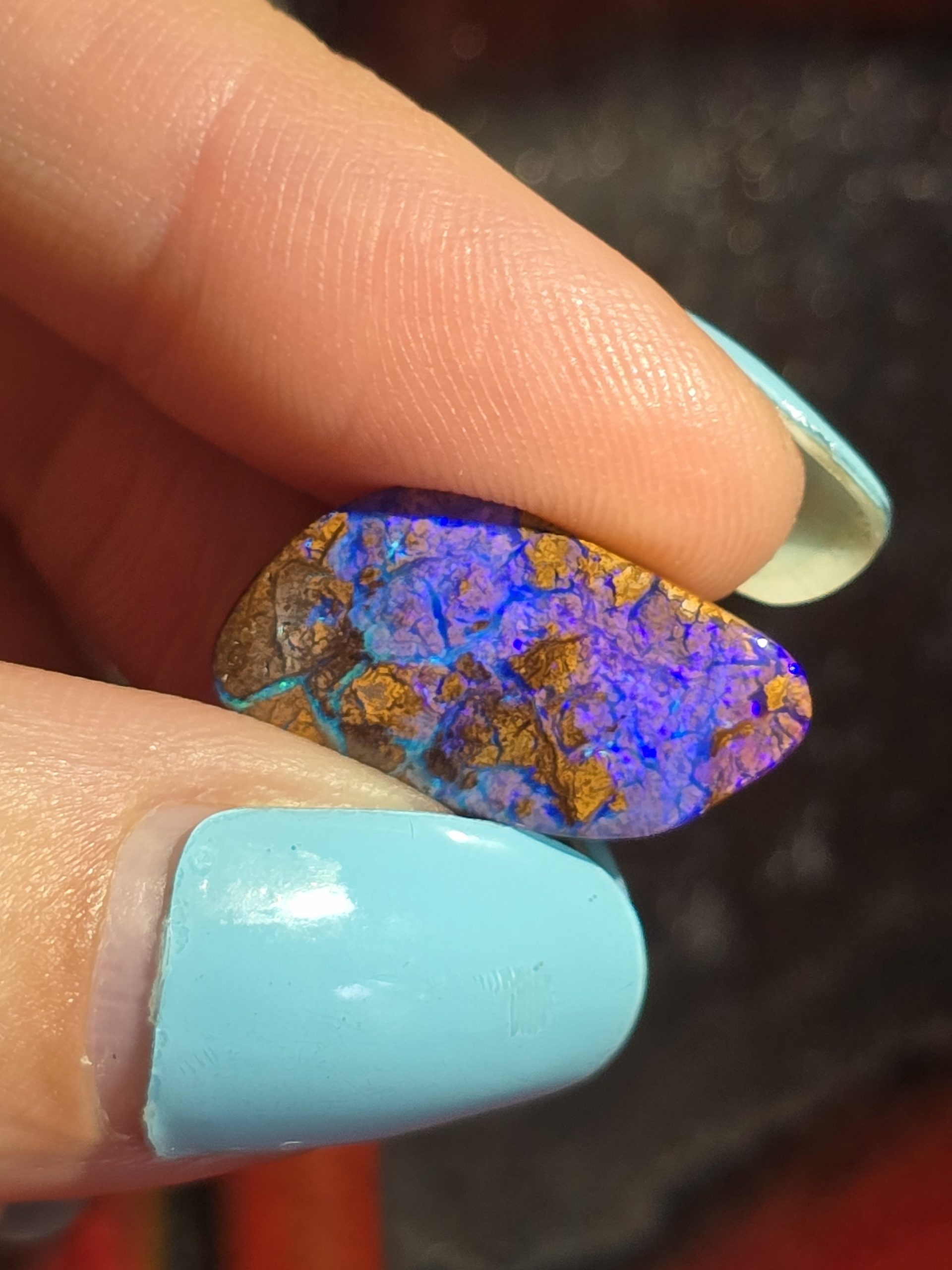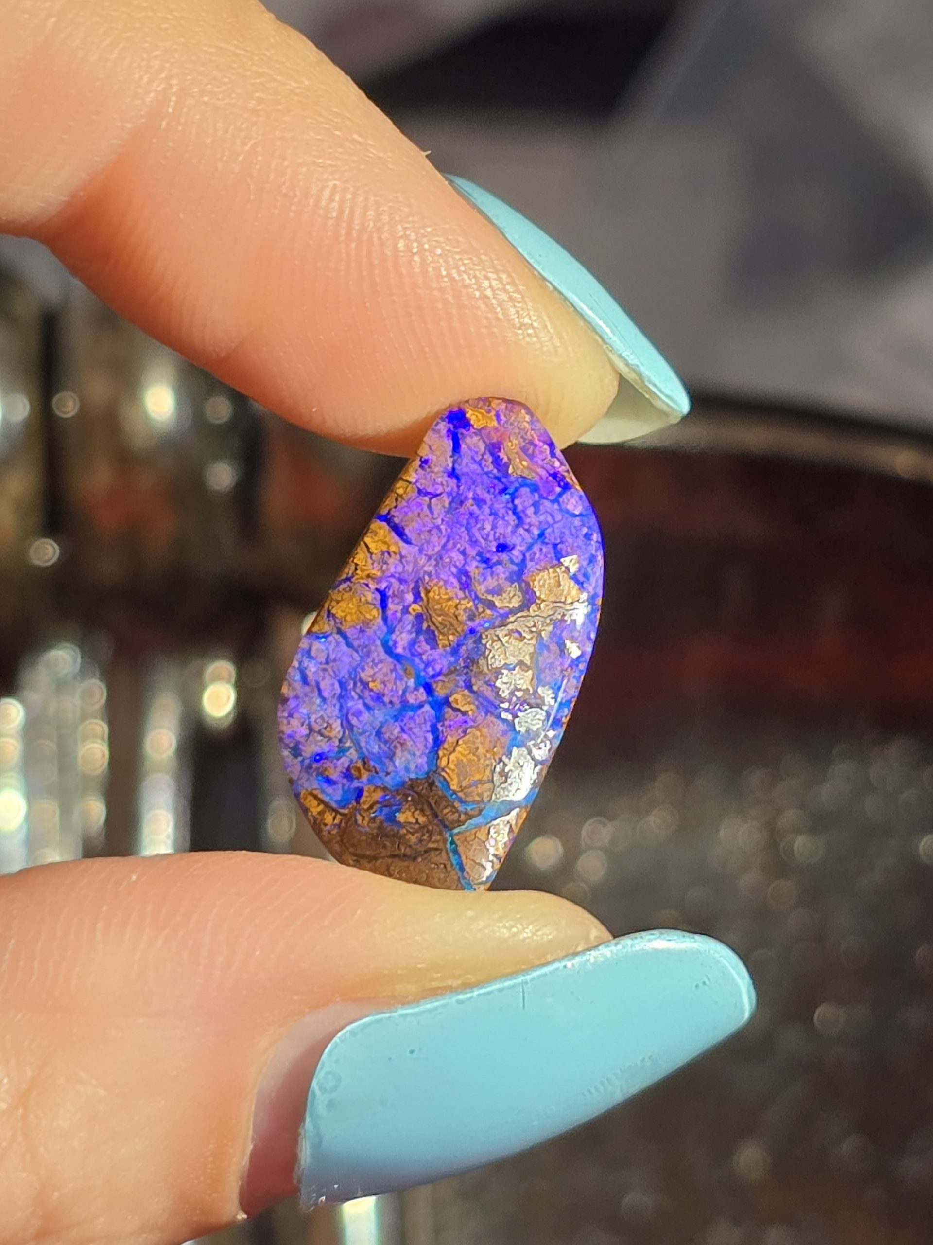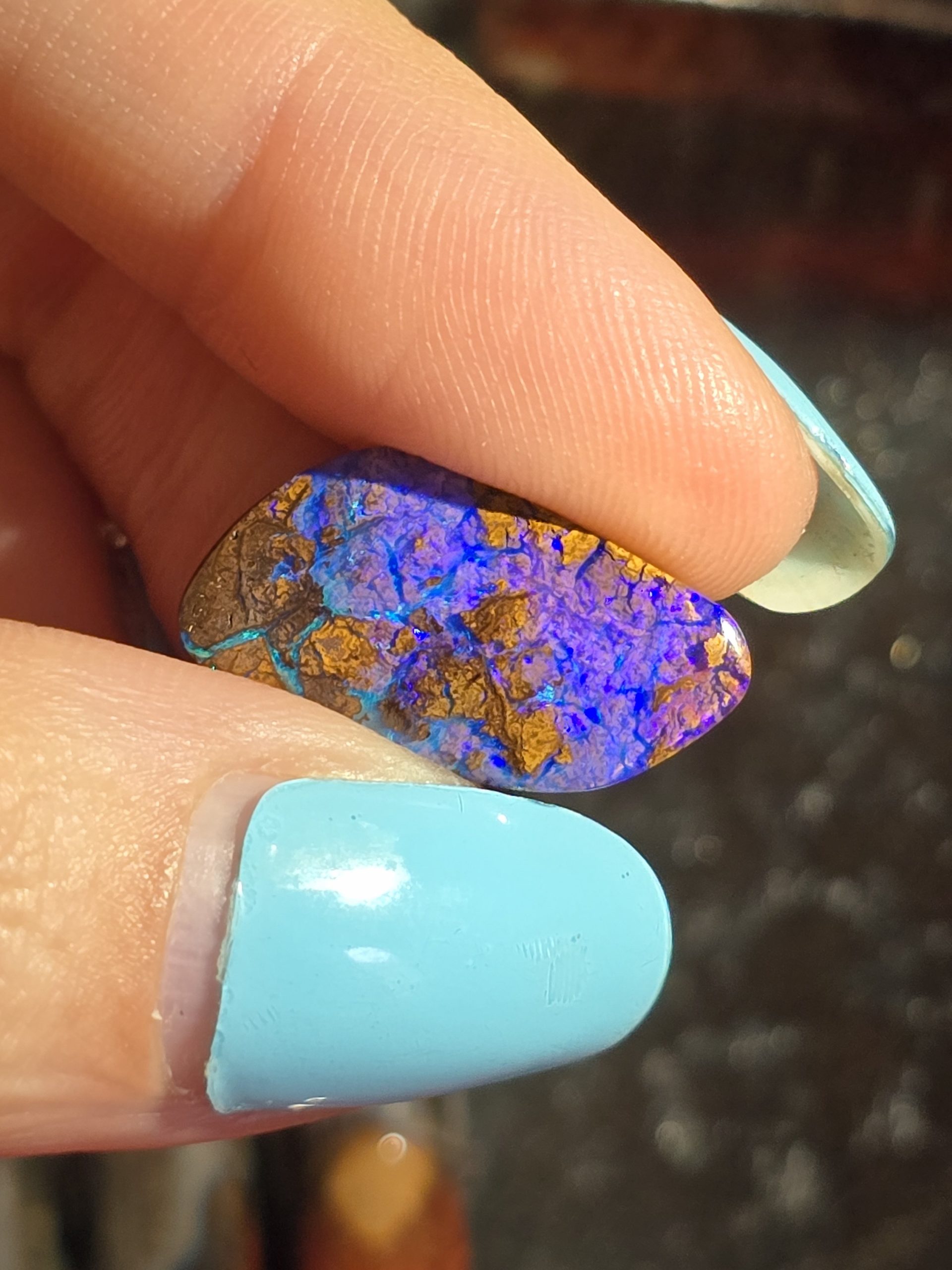 Bonjour je vous propose une merveille de la nature, une pièce charismatique aux éclats violets et bleu électrique, relevés de touches turquoise et orangées sur une matrice chocolat.