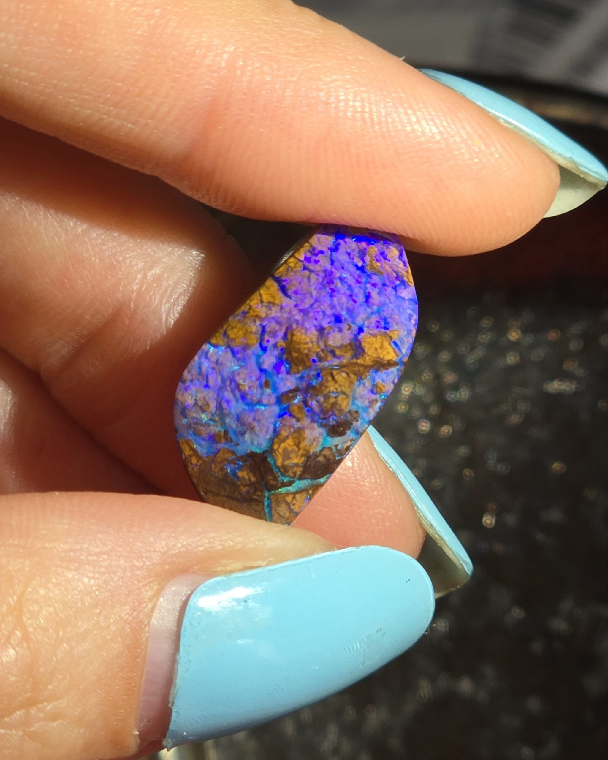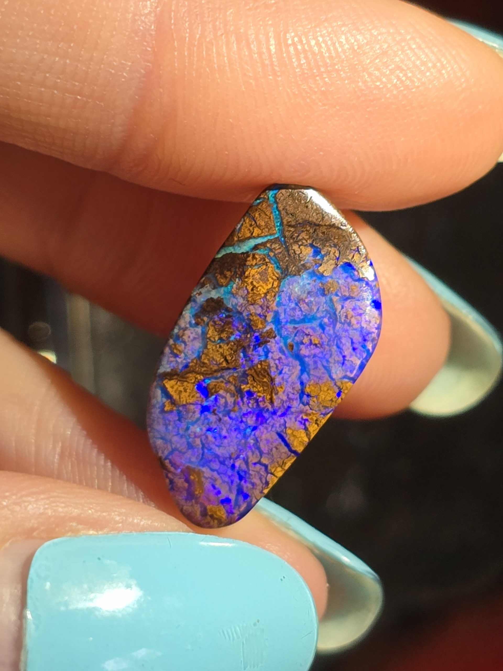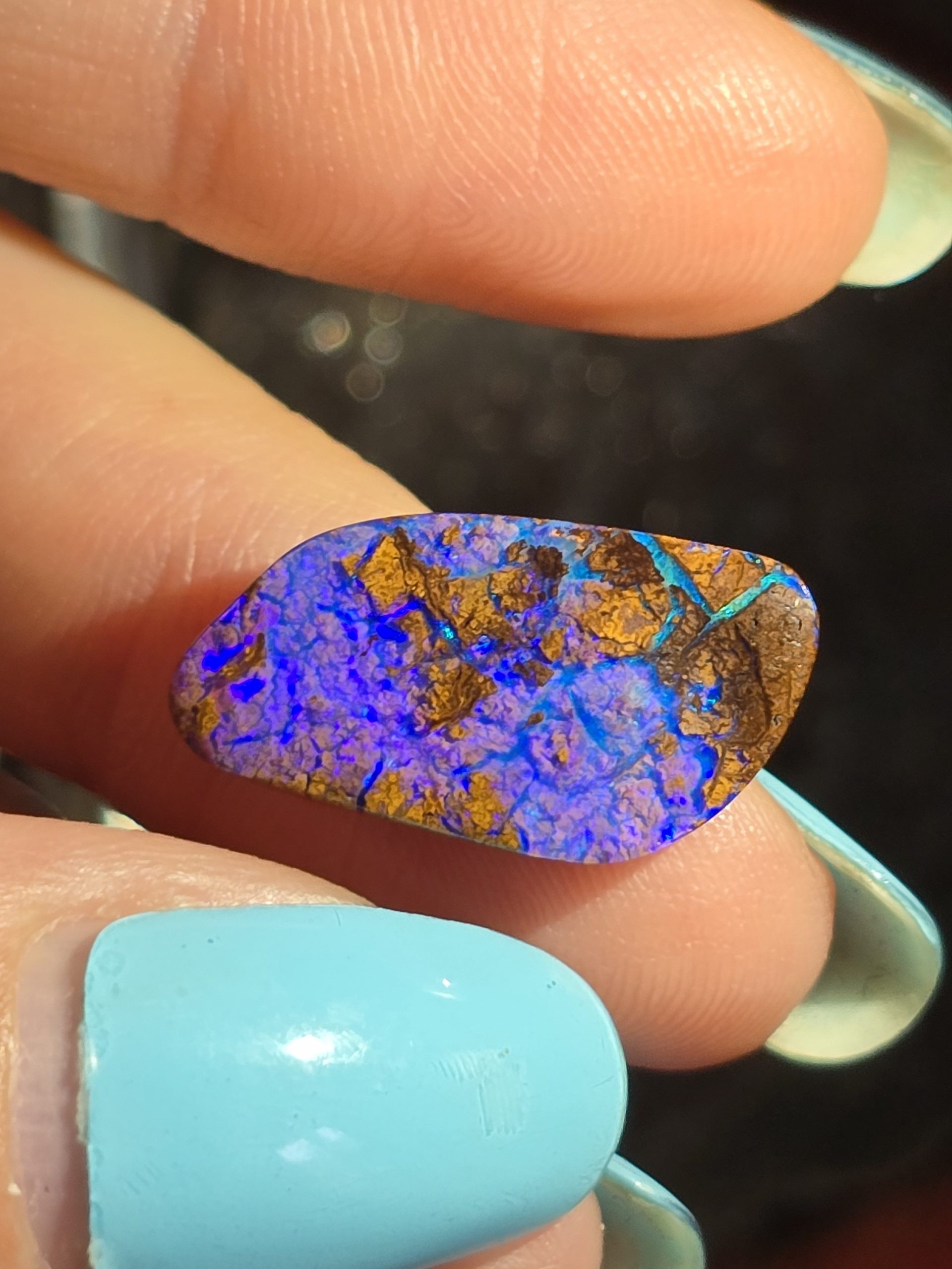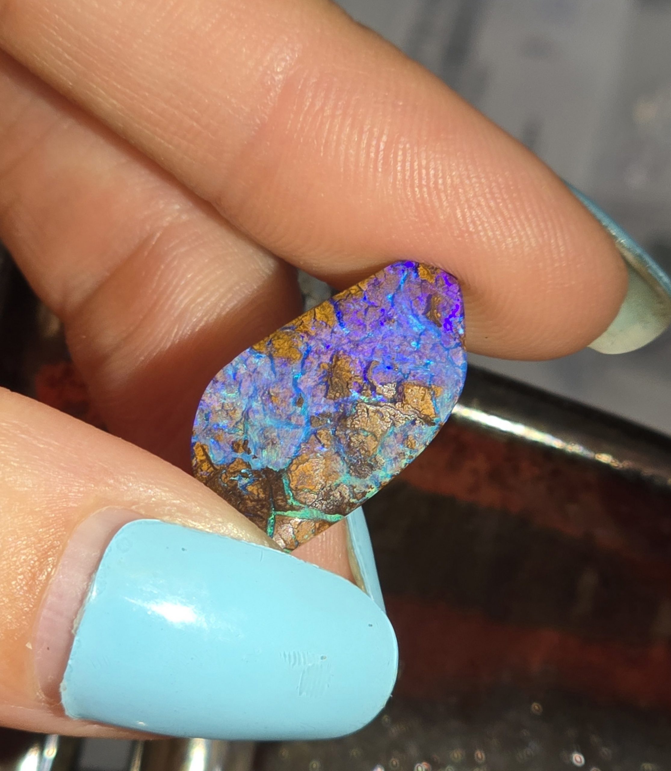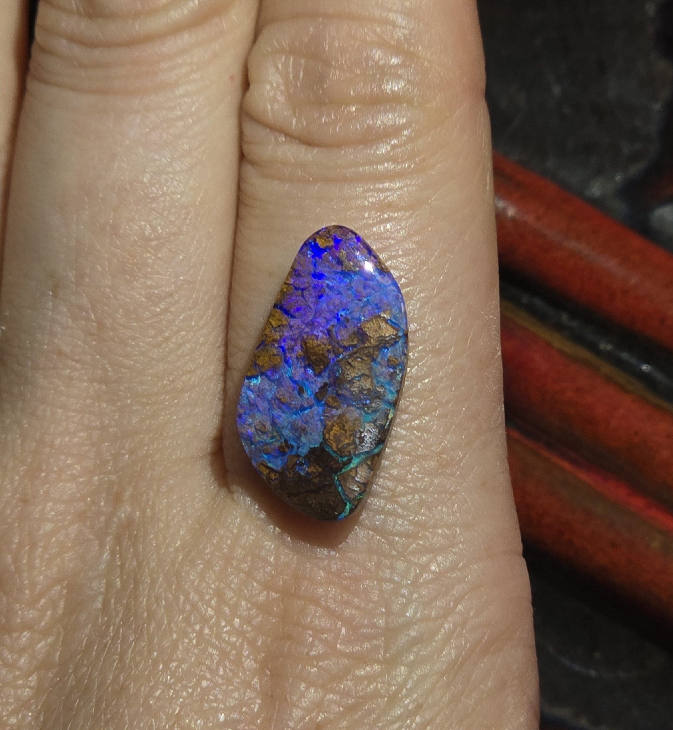 Matrice : Ironstone brun à texture “lace/mosaic”, veines et plages d’opale intercalées.