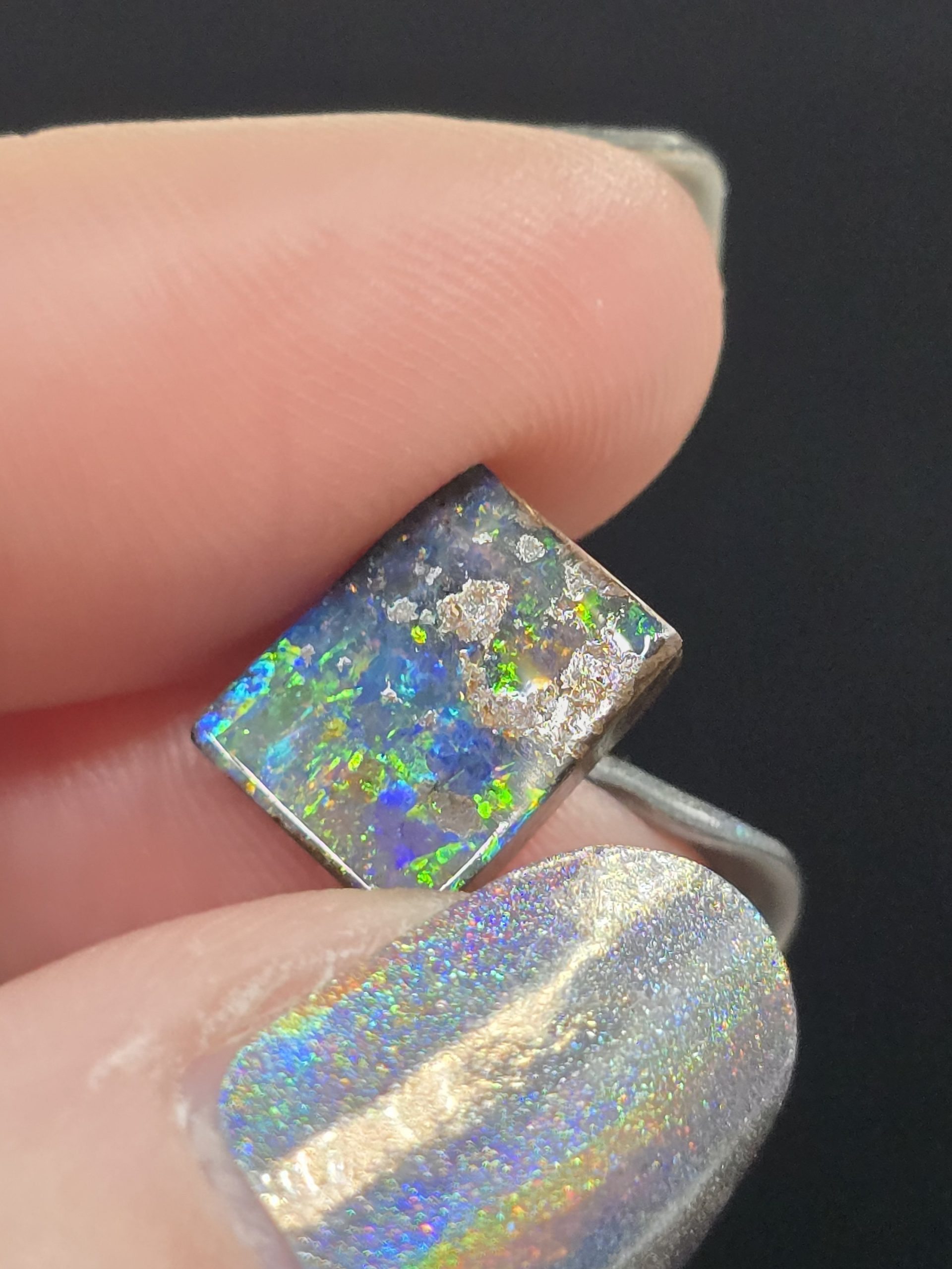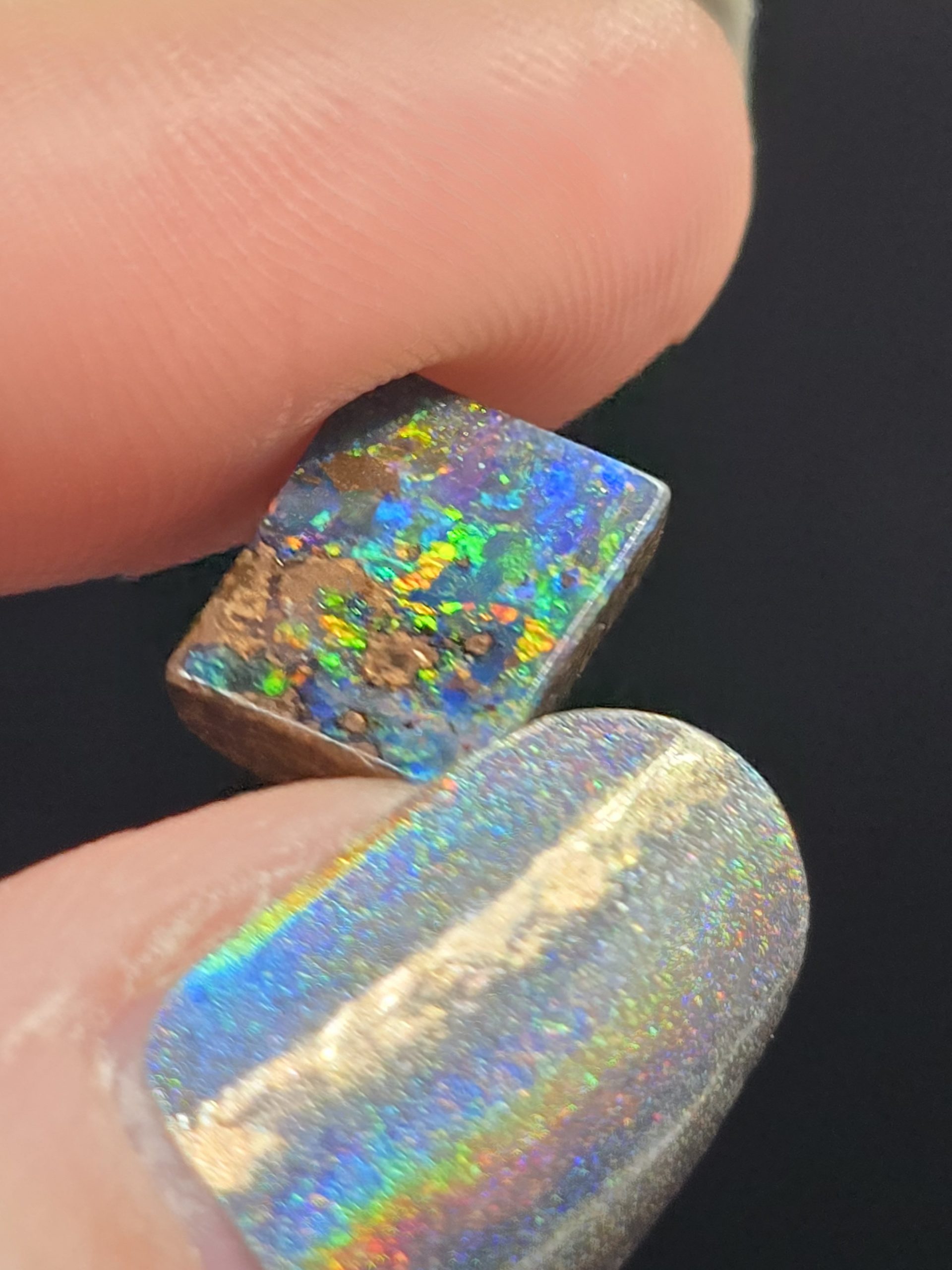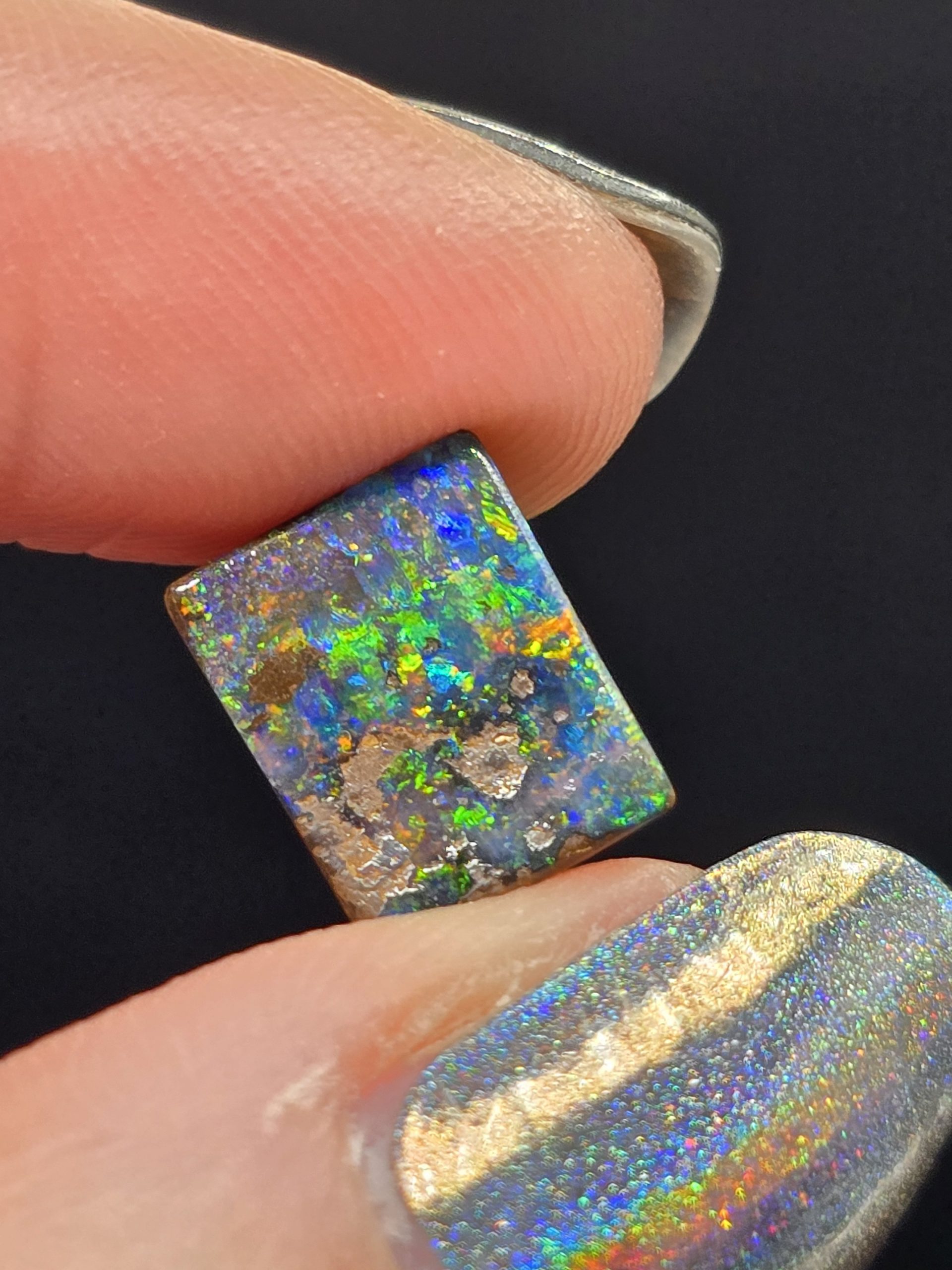 Taillée dans un format géométrique affirmé, cette opale se prête parfaitement à une création joaillière audacieuse : bague architecturale, pendentif sculptural ou pièce unique de collection.
