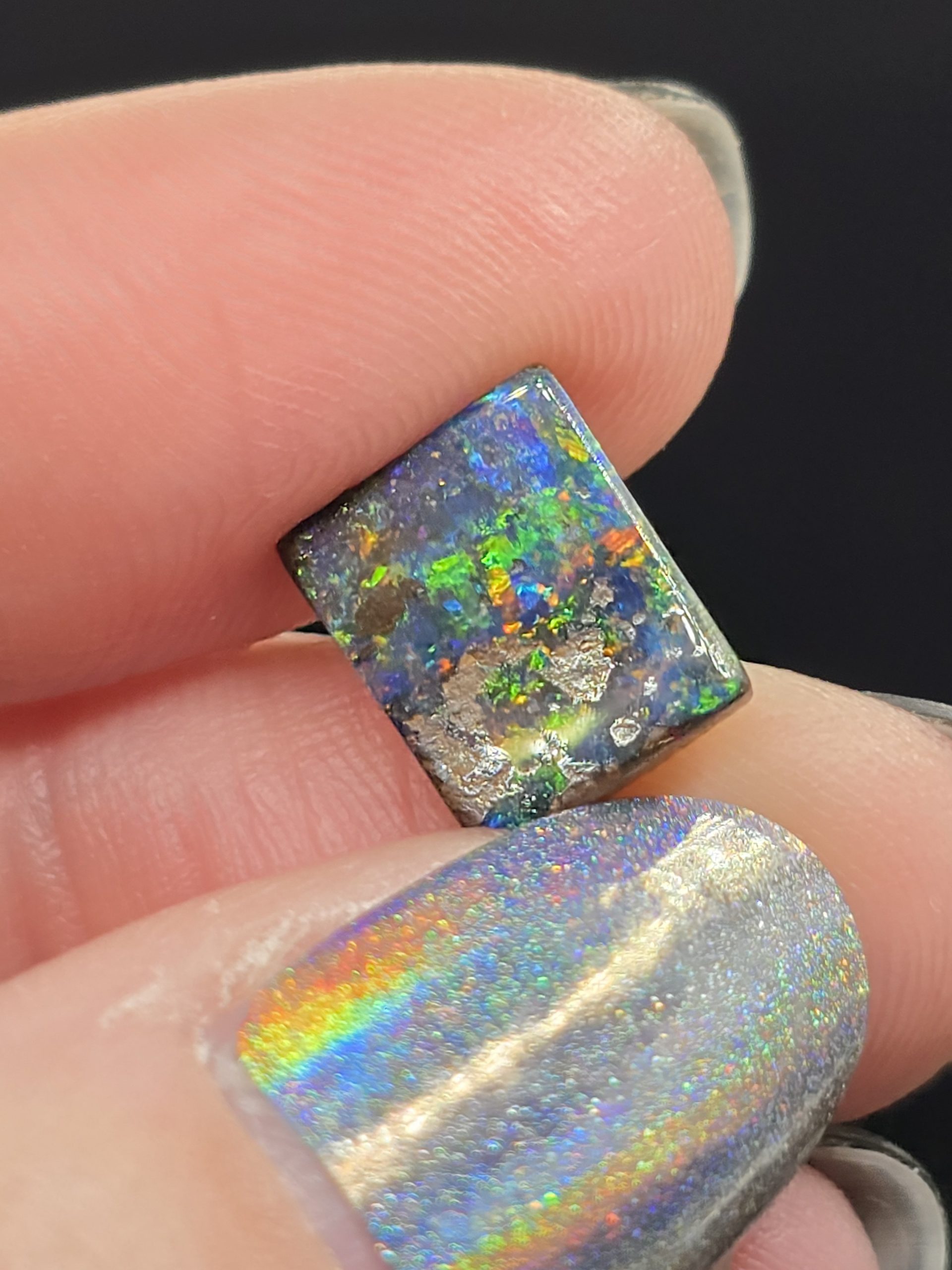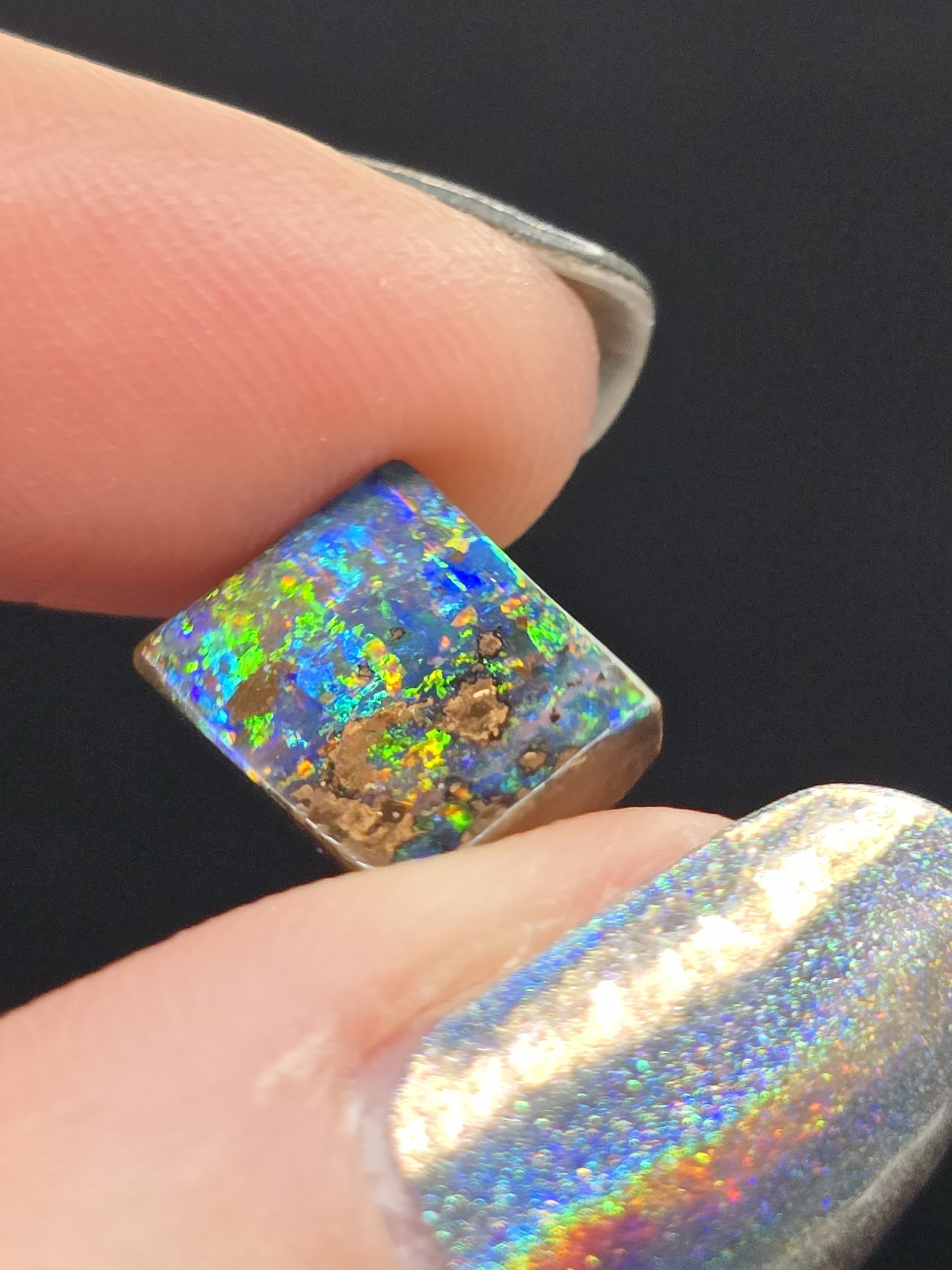 Bonjour je vous propose cette magnifique opale boulder dévoile qui une opalescence spectaculaire, dense et vibrante, où s’entrelacent des verts électriques, des bleus profonds et des éclats multicolores intenses. La surface opaline, presque picturale, offre un jeu de couleurs vivant qui s’illumine à chaque mouvement.