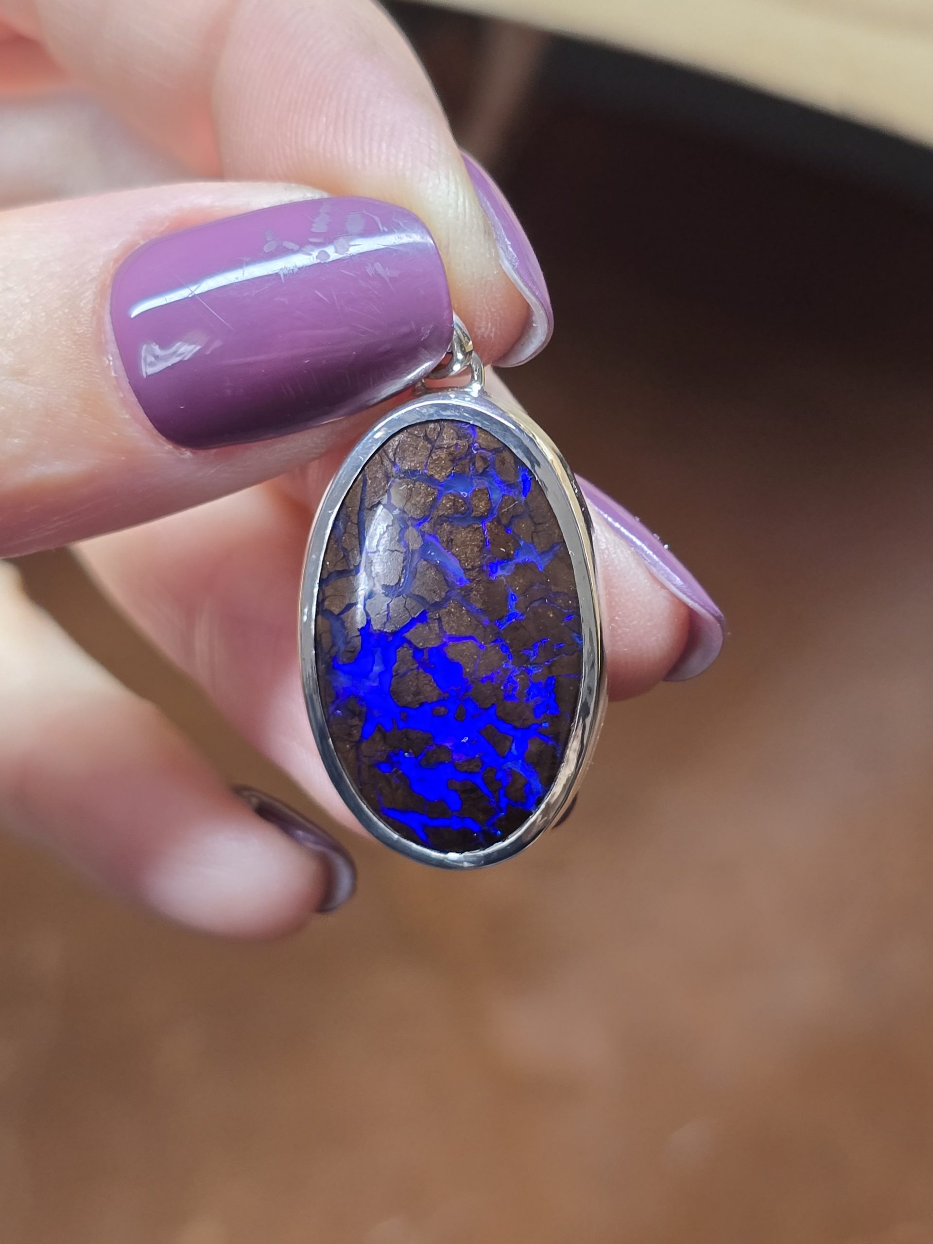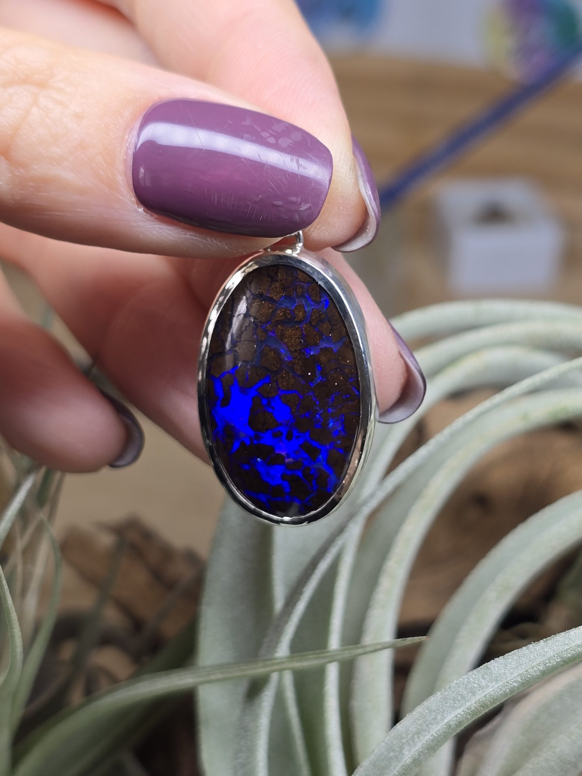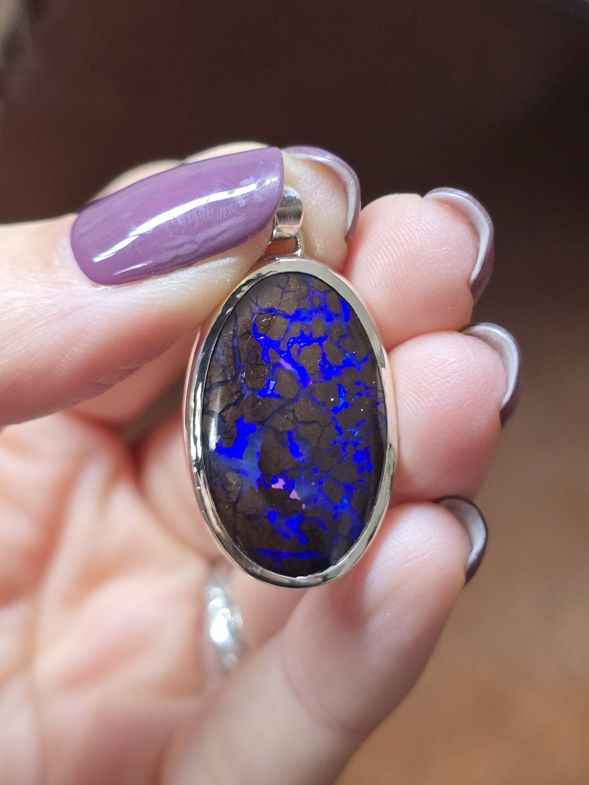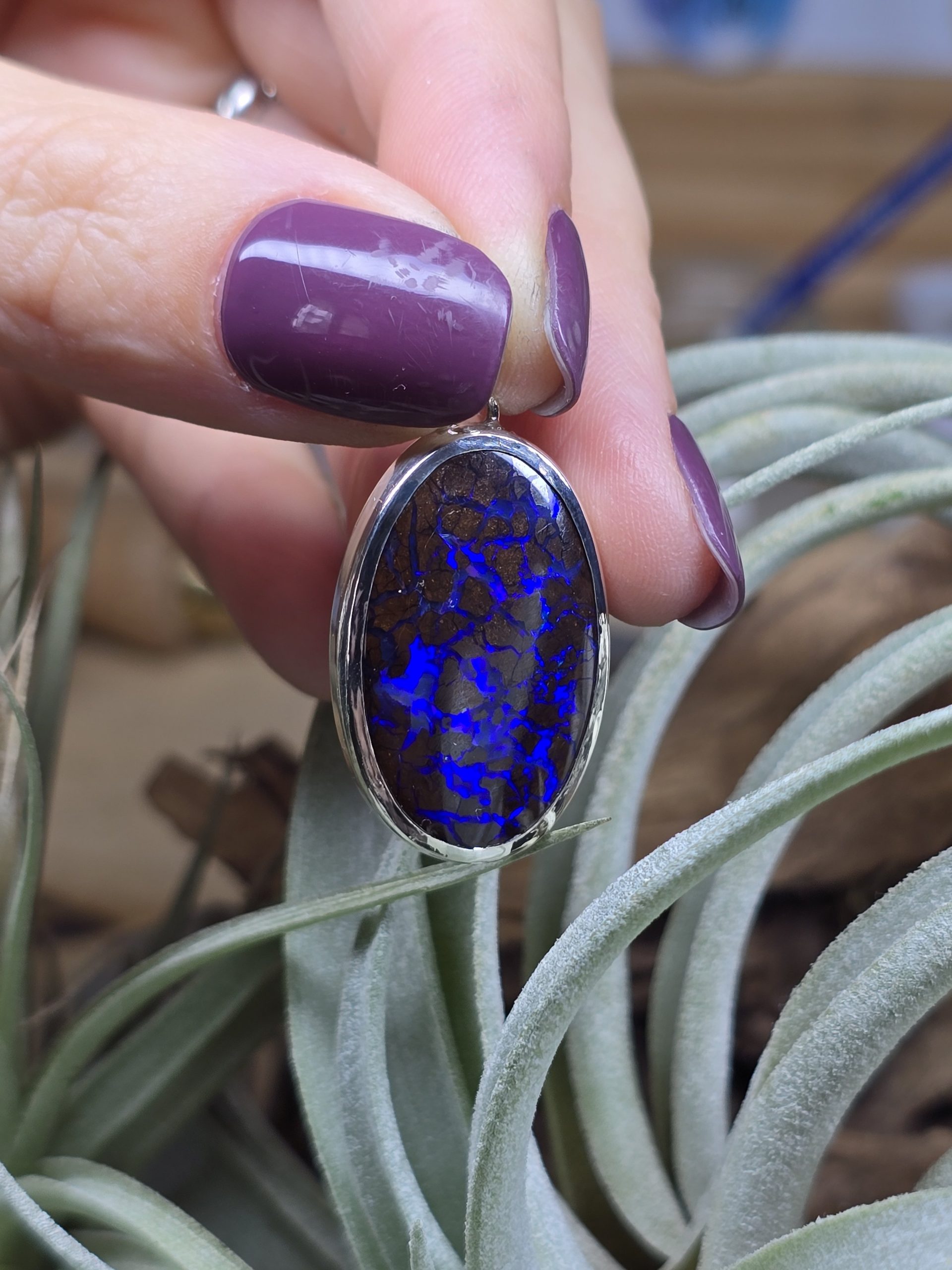 Bonjour je vous propose un très beau pendentif unique associe la force brute de la nature et l’élégance de l’artisanat. Sertie en argent massif, l’opale boulder révèle un jeu de veines bleu électrique sur sa matrice chocolat, créant un contraste saisissant et hypnotique. Une création authentique, façonnée à la main, qui incarne le caractère et l’unicité de l’Australie.