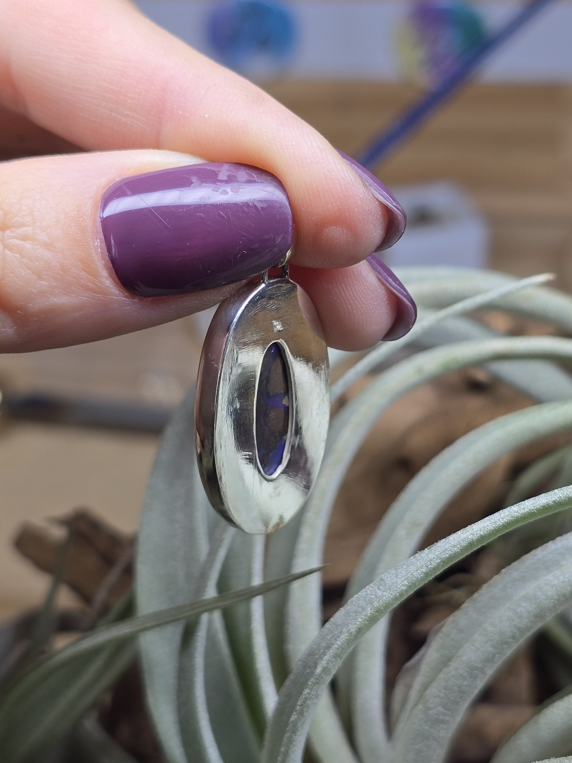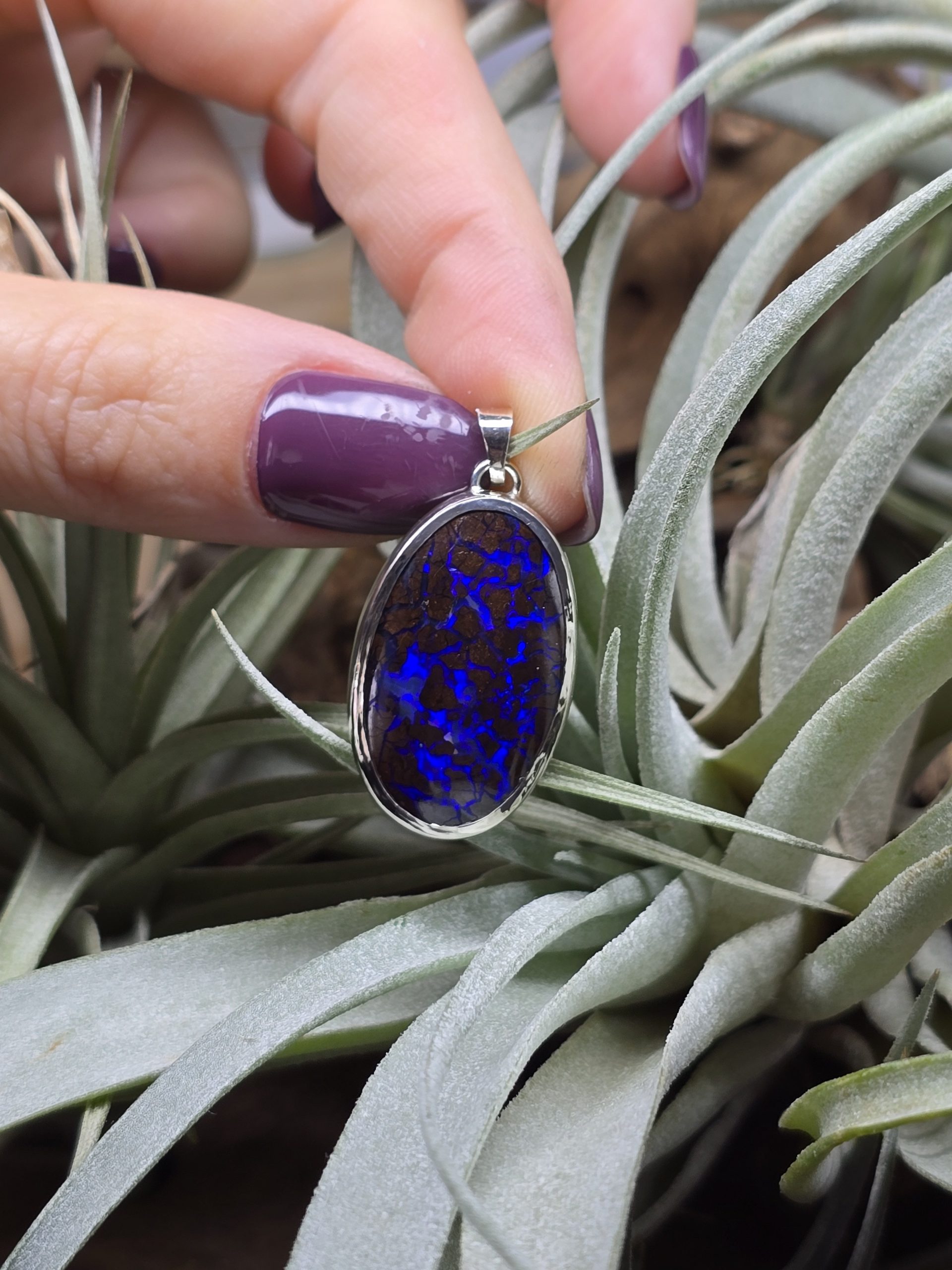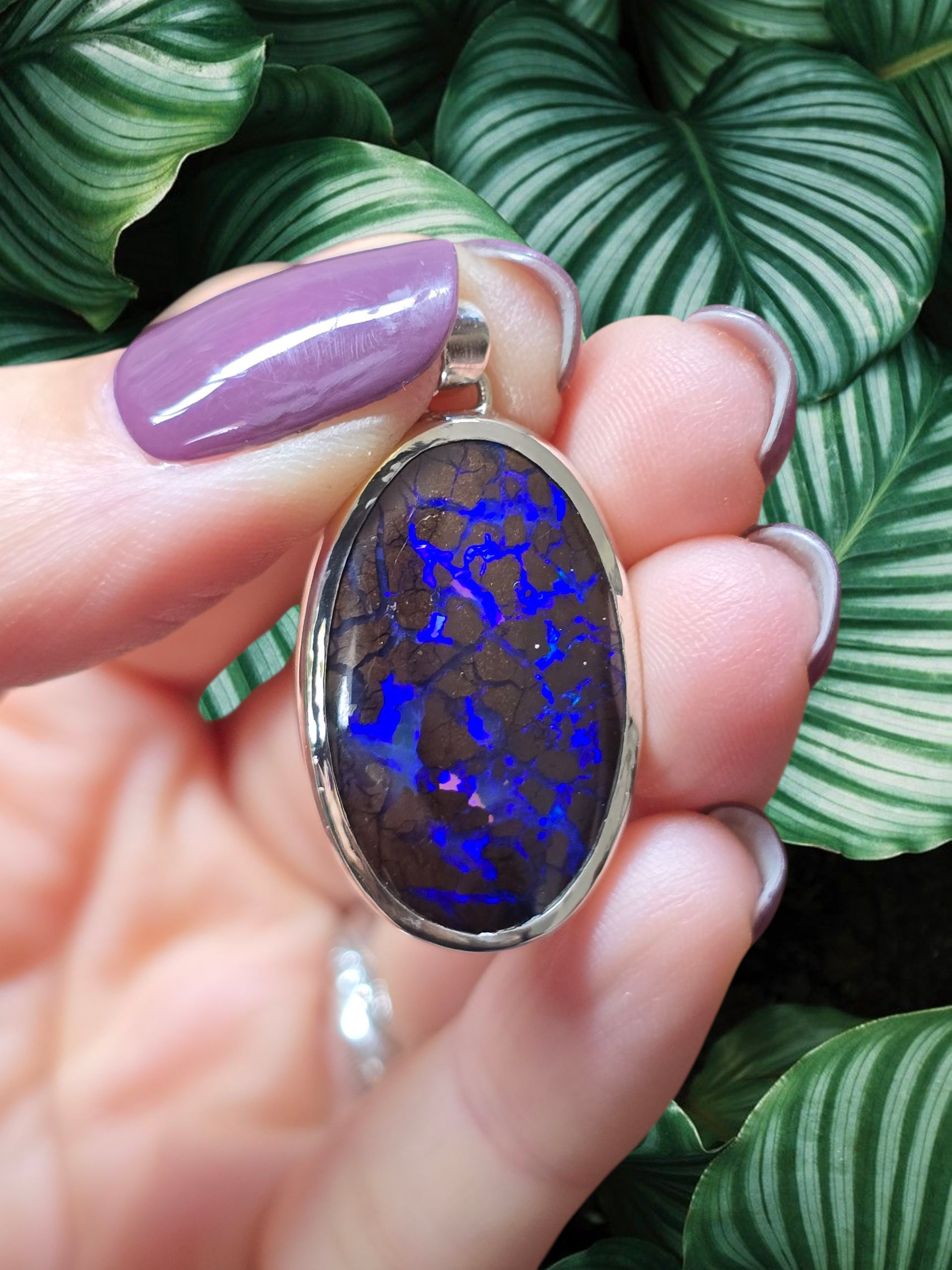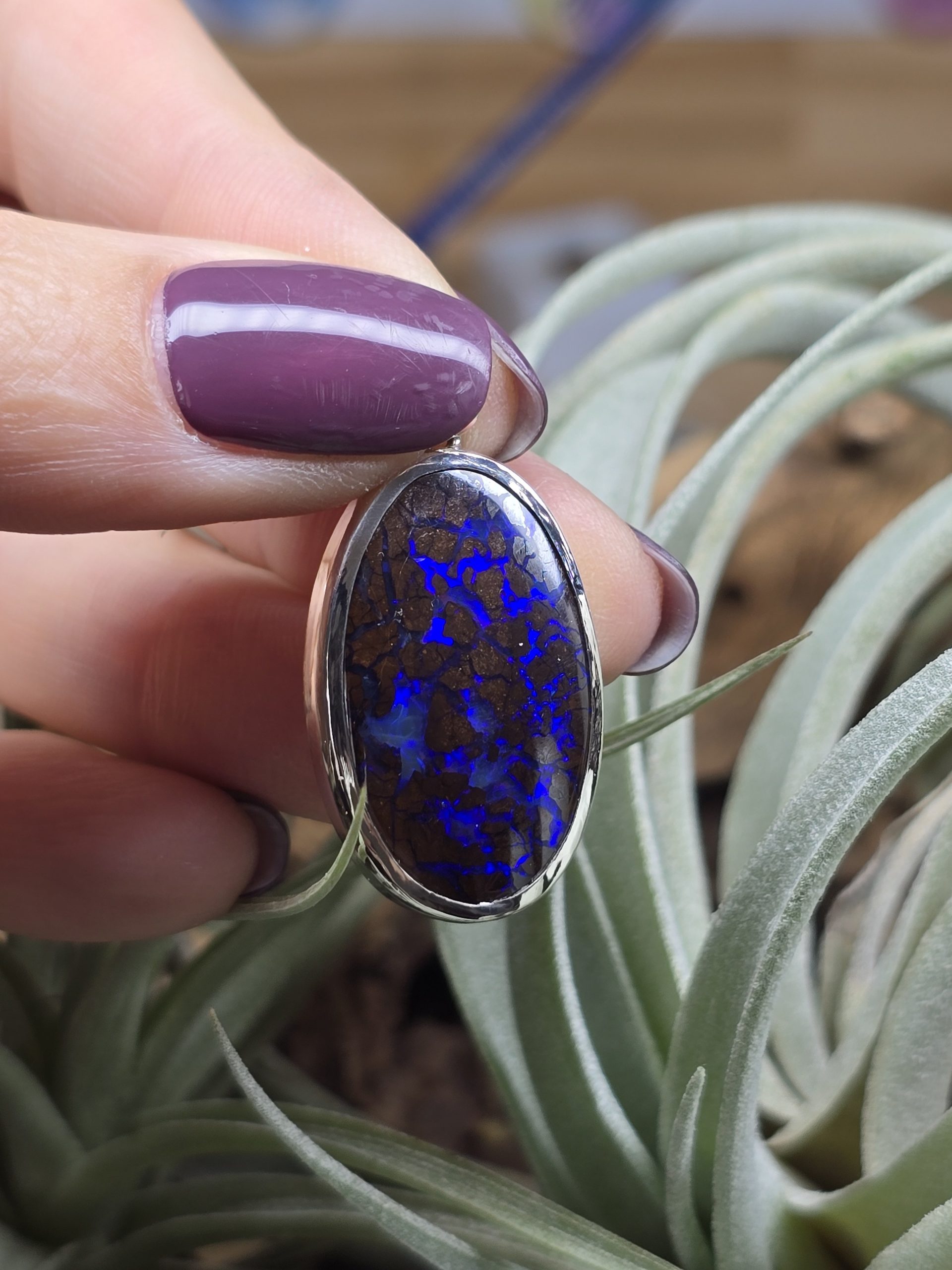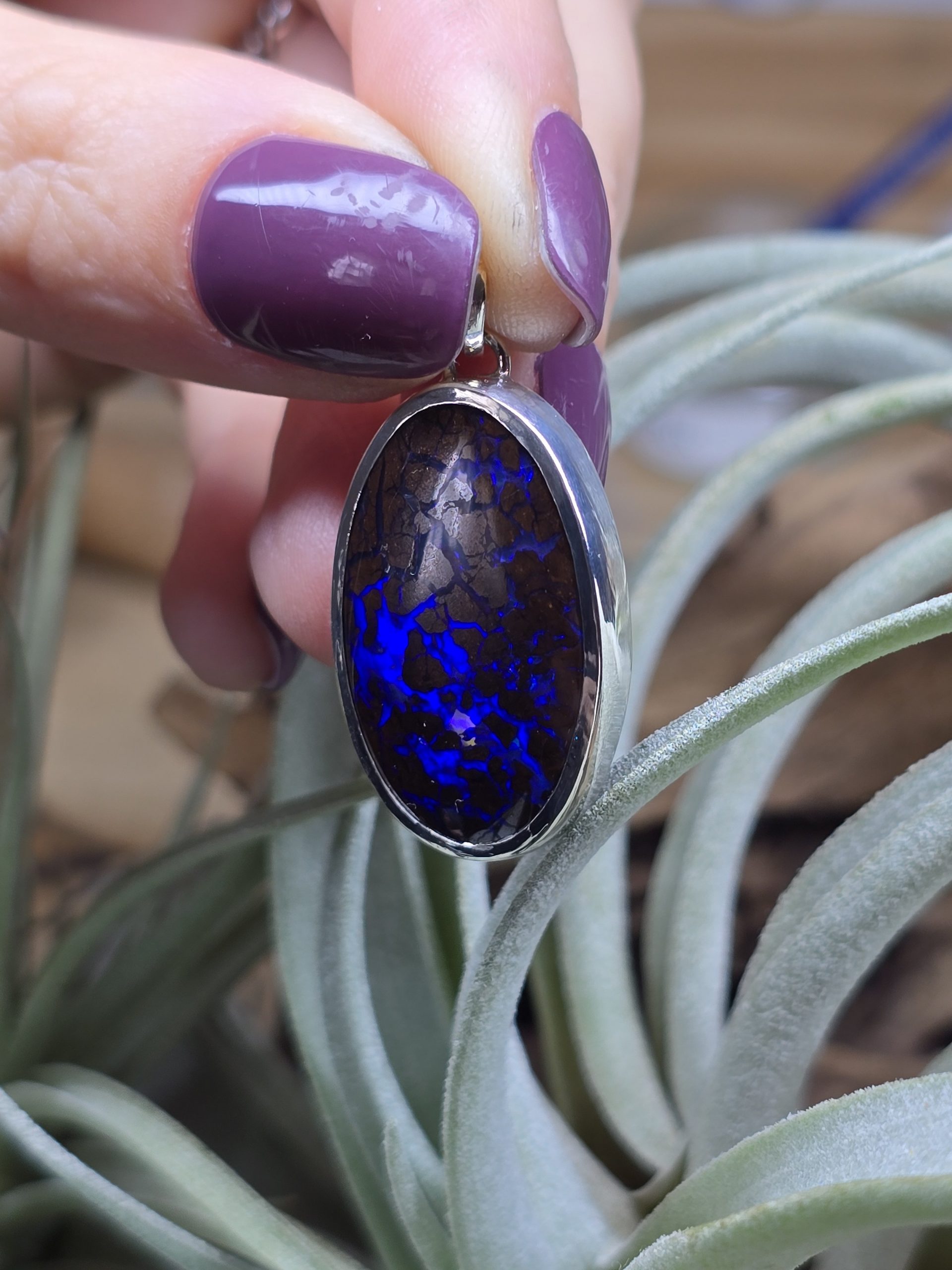 Bonjour je vous propose un très beau pendentif unique associe la force brute de la nature et l’élégance de l’artisanat. Sertie en argent massif, l’opale boulder révèle un jeu de veines bleu électrique sur sa matrice chocolat, créant un contraste saisissant et hypnotique. Une création authentique, façonnée à la main, qui incarne le caractère et l’unicité de l’Australie.