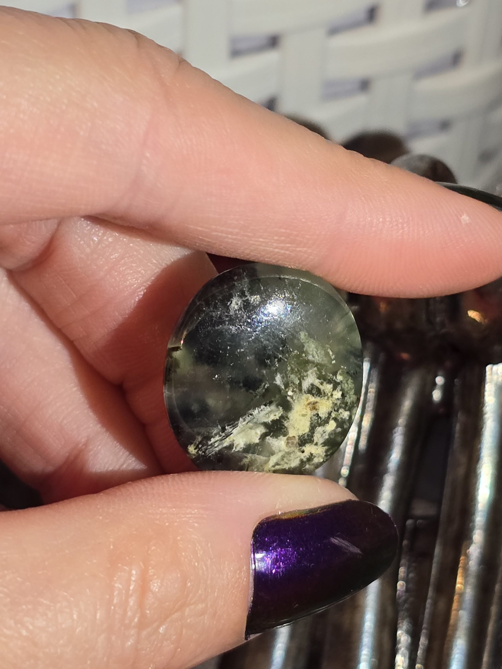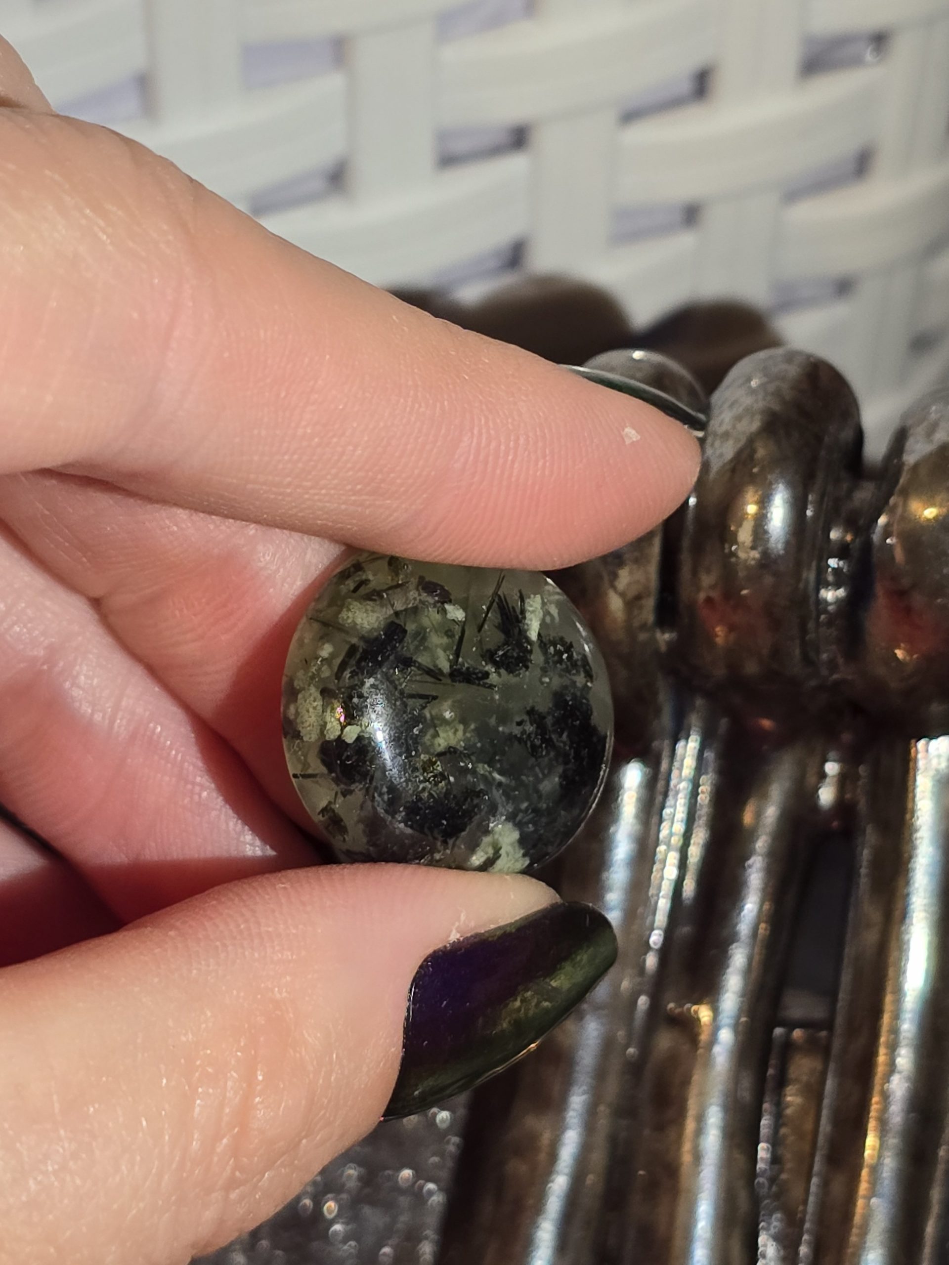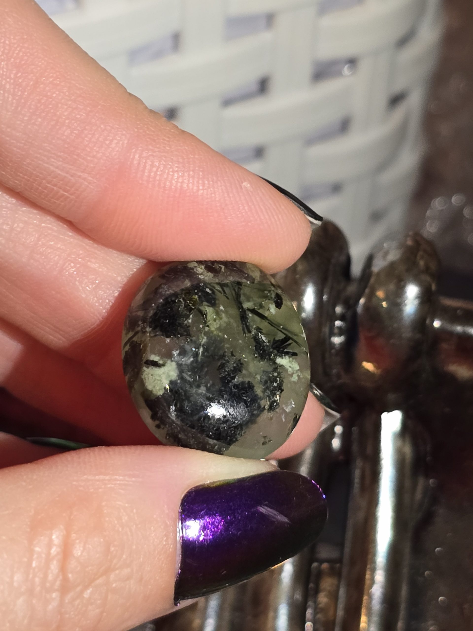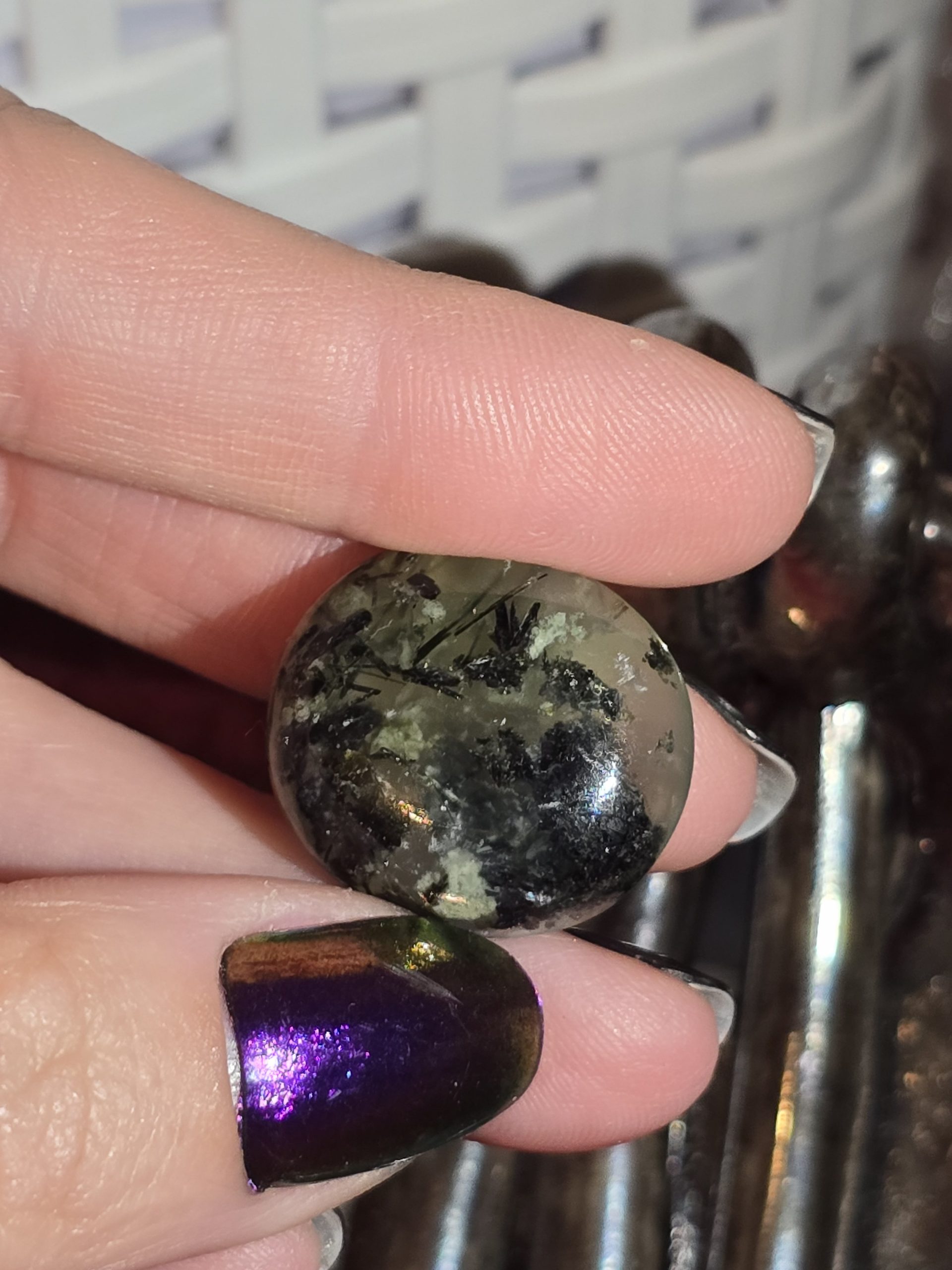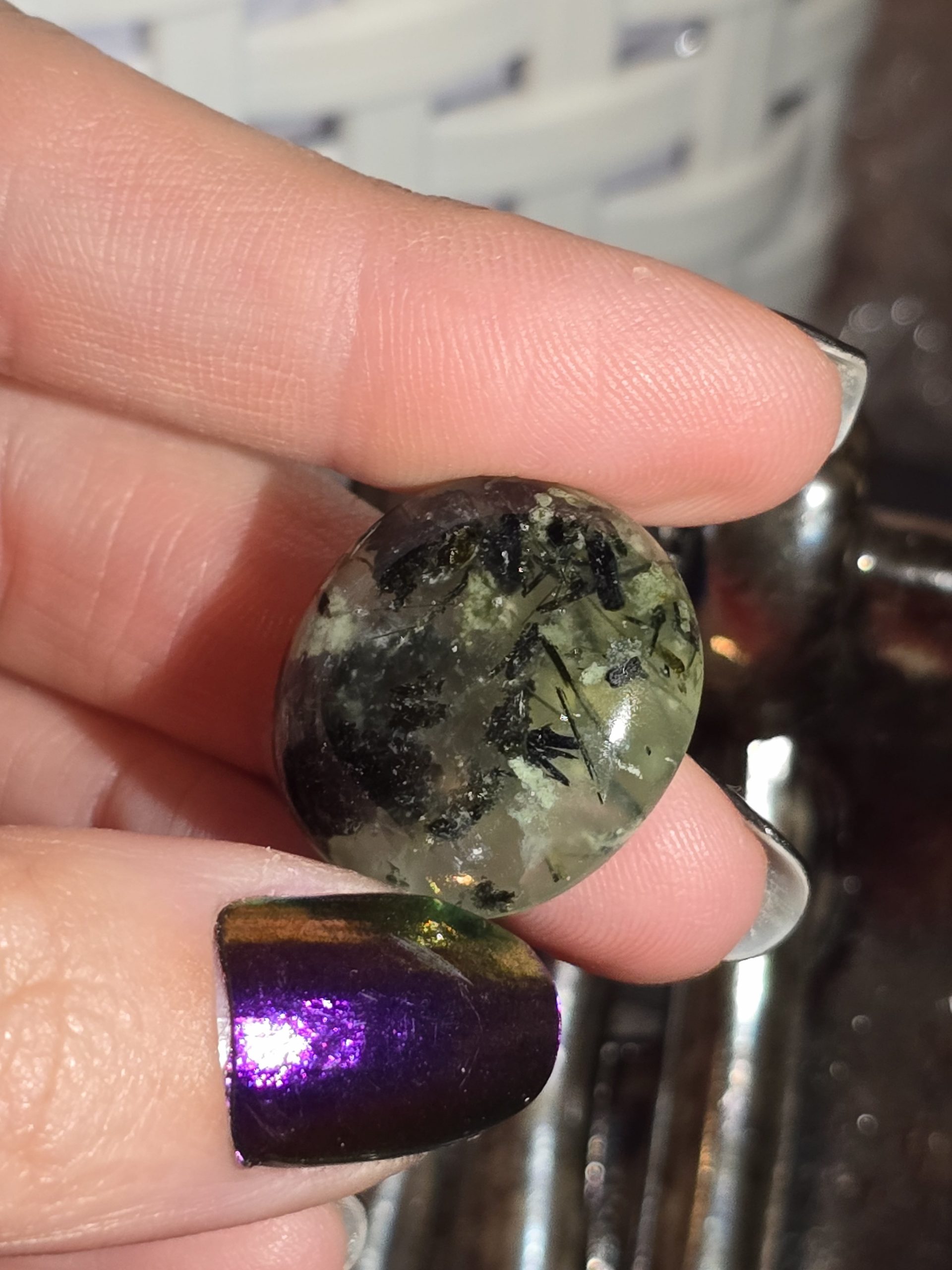 Bonjour je vous propose une préhnite naturelle, cabochon rond poli. Couleur vert clair translucide, avec inclusions de cristaux noirs typiques (souvent épidote ou tourmaline). Pierre authentique, idéale pour un bijou artisanal ou une pièce de collection.